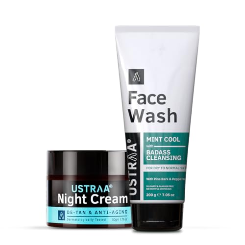Ustraa Face Wash - Dry Skin - Mint cool with badass cleaning. Moisturising face wash which wont leave your skin dry. With pine bark and peppermint extracts for a firm and hydrated skin appearance. If you have a dry skin or normal skin this is the skin care you need. This product is completely paraben and sulphate free. Ustraa Night Cream - De-tan and Anti-aging - This night cream is a complete work horse for men. It is designed to take complete care of a manâs skin requirements.It deeply moisturizes and targets three common skin issues that make you look aged the mostâwrinkles uneven tone and dark spots. This lightweight cream has been designed in a way that you wonât feel a thing while sleeping.