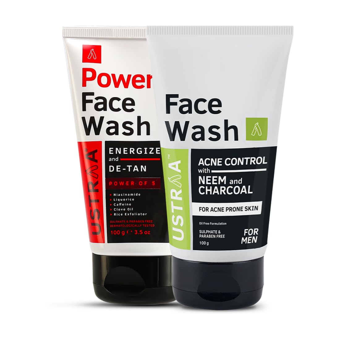 Ustraa Face Wash Acne Control - With Neem & Charcoal - The anti-septic skin healing properties of neem and the badass cleansing action of charcoal come together in this face wash to give your face extra protection against acne and break-outs. An oil-free formulation this also helps keep your face oil-free for longer. So you don't feel sticky and oily all day. Specially formulated for sensitive and acne prone skin This face wash has no sls no paraben and no harmful chemicals. Ustraa Power Face Wash - If stress and pollution has left your face tired then this is just the face wash you need. With the power of Niacinamide Caffeine Rice Particles Clove Oil. Liqourice it helps give your face the extra charge of energy and also builds skin immunity. This face wash minimizes pores reduces redness and also helps repair environmental damage & energizes skin cells.