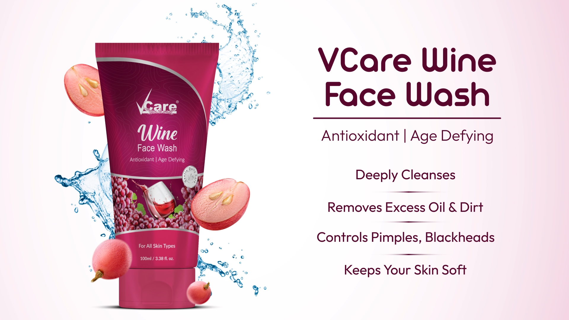 Vcare Red Wine Face Wash Suitable for All Skin Types|Younger-Looking Skin|Anti-Oxidant Oily Skin & Age Defying Bright Refreshed Skin All Day | Buy 1 Get 1 Free 100g (Wine Face Wash)