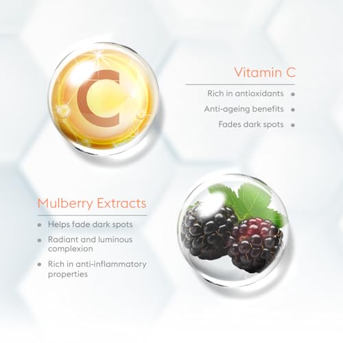 • Mulberry Extracts: Helps fade dark spots Known for its skin-brightening properties contributing to a radiant and luminous complexion.