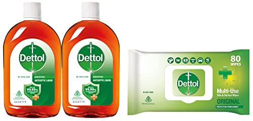 Dettol Antiseptic Disinfectant liquid for First aid Surface Cleaning and Personal Hygiene 250ml Pack of 2Dettol Antiseptic Liquid protects you and your family from 100 illness causing germs. It comes in a fresh pine fragrance. The topical antiseptic liquid sanitizes your home and helps maintain your personal hygiene. The Dettol first aid antiseptic liquid can be used to protect against infection from cuts and scratches disinfect toys and sanitize baby wear leaving everything clean and fresh. It can also be used as a household disinfectant and cleaner on surfaces or in laundry cleaning to kill germs. This liquid antiseptic is recommended by Indian Medical Association and can be kept in your emergency first aid kit. USAGE: Recommended dilutions to protect your family from germs: Bathing â 5ml to a bucket of water (10 litres); First Aid- 15ml to 300ml of water; Shaving Antiseptic Liquid- 15ml to 300ml of water; Nappy Wash â 12.5ml to 500ml of wateDettol Disinfectant Sanitizer Wet Wipes for Skin & Surfaces Original â 80 Count| Moisture-Lock Lid | Safe on Skin | Ideal to Clean SurfacesDettol's Disinfecting Skin & Surface Wipes are Safe on Skin Ideal to Clean Multiple Surfaces Easy to carry with a resealable Moisture-lock lid. Dettol disinfecting wipes are practical for everyday use on furniture taps sinks door knobs kitchen bathroom surfaces floor cleaning childrenâs surfaces and places that are germ hotspots. It can be used on most hard non-porous surfaces including Finished Wood Sealed Marble Stainless Steel Laminated Floors Glass and Plastic.