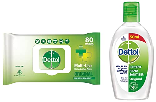 Dettol Disinfectant Sanitizer Wet Wipes for Skin & Surfaces Original â 80 Count| Moisture-Lock Lid | Safe on Skin | Ideal to Clean SurfacesDettol's Disinfecting Skin & Surface Wipes are Safe on Skin Ideal to Clean Multiple Surfaces Easy to carry with a resealable Moisture-lock lid. Dettol disinfecting wipes are practical for everyday use on furniture taps sinks door knobs kitchen bathroom surfaces floor cleaning childrenâs surfaces and places that are germ hotspots. It can be used on most hard non-porous surfaces including Finished Wood Sealed Marble Stainless Steel Laminated Floors Glass and Plastic.Dettol Original Germ Protection Alcohol Based Hand Sanitizer 50mlWith infections leading to diseases on the rise it is our hands that transfer most of the germs by touching various viruses and microbes daily though unintentionally. Washing your hands with soap and water is the best way to reduce the number of microbes on them. However there can be situations where soap and/ or water are not available. In this situation where nothing else really helps Dettol Hand Sanitizers can give you that protection and safety to ensure upto 99.99% Germ Protection. Simply apply a few drops of the disinfectant gel on your hand and rub them thoroughly and voila! You are protected! Your Trusted Dettol offers a new and improved Dettol Hand Sanitizer that is rinse free and non-sticky. It is specially formulated to protect you from 100 illness causing germs. With an easy application drop bottle you can protect yourself & your family from a wide range of illness causing germs anytime anywhere without soap or water. The great thing with the new and improved hand sanitizers by Dettol is that it comes in exciting two variants - floral and spring fresh. So now apart from being clean and fresh you also have superb smelling hands. Keeping germs at bay with Dettolâs on-the-go instant hand sanitizer packs is easy. It is in addition enriched with Moisturizers that doesnât let your hands dry up and leave them 99.9 percent germ-free. These sanitizer bottles are convenient to carry and can be placed anywhere from your pocket purse or bag for on-the-go convenience.