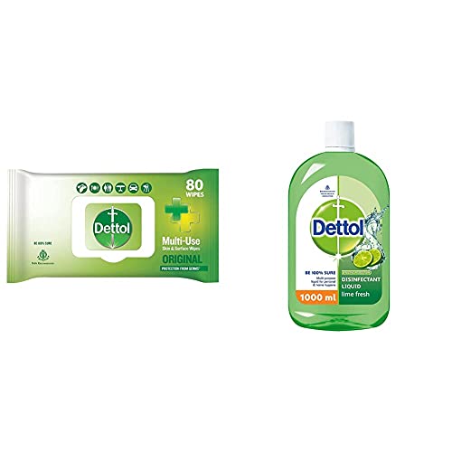 Dettol Disinfectant Sanitizer Wet Wipes for Skin & Surfaces Original â 80 Count| Moisture-Lock Lid | Safe on Skin | Ideal to Clean SurfacesDettol's Disinfecting Skin & Surface Wipes are Safe on Skin Ideal to Clean Multiple Surfaces Easy to carry with a resealable Moisture-lock lid. Dettol disinfecting wipes are practical for everyday use on furniture fridges taps sinks door knobs kitchen bathroom surfaces floor cleaning childrenâs surfaces and electronics that are germ hotspots. It can be used on most hard non-porous surfaces including Finished Wood Sealed Marble Stainless Steel Laminated Floors Glass and Plastic.Dettol Liquid Disinfectant for Floor Cleaner Surface Disinfection Personal Hygiene (Lime Fresh 1L)Dettol Disinfectant Multipurpose Liquid cleaner provides protection to you and your family against illness causing germs. This disinfectant liquid sanitizes your home and also helps maintain your personal hygiene. It can be used in bath laundry floor and surface cleaning leaving everything clean and fresh. This multipurpose disinfenctant cleaner for home is recommended by Indian Medical Association. USAGE: Recommended dilutions to protect your family from germs: Bathing - 1 capful to a bucket of water (10 litres); Kitchen Slab - 1 capful to a litre of water; Shaving - 1 capful to a litre of water; Floor Cleaning - 1 capful to a litre of water; Laundry - 1 capful to a litre of water in the last rinse; Refrigerator - 1 capful to a litre of water. If swallowed seek immediate medical advise.