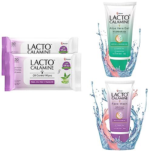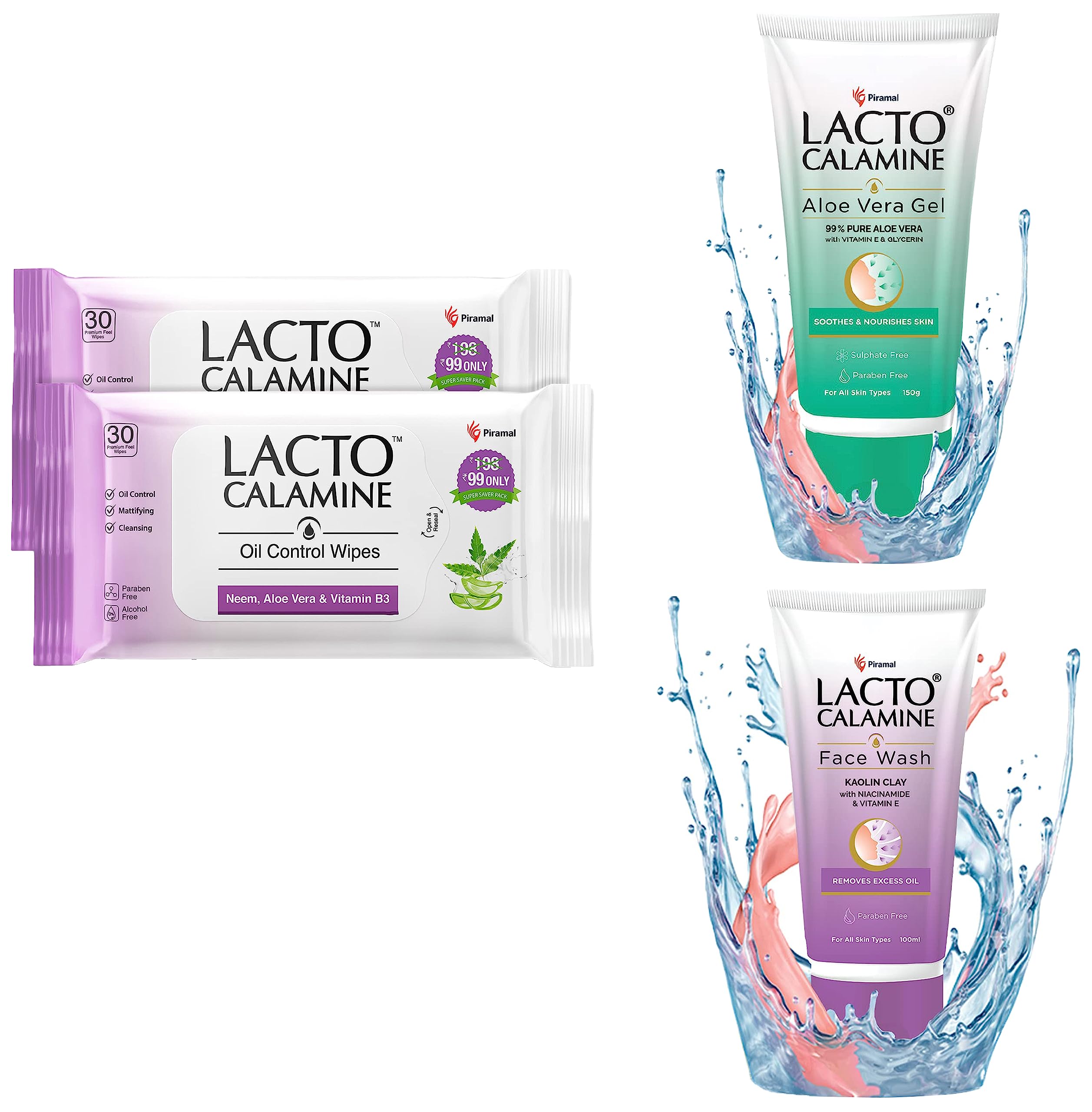Lacto Calamine Aloe Vera Gel with 99% Pure Natural Aloe Vera Vitamin E and Glycerin for non-sticky hydration and cooling effect. Lightweight. Soothes and Nourishes skin. No Parabens No Sulphates - 150 g - Pack of 1Lacto Calamine Aloe Vera Gel is a lightweight and non-sticky gel that hydrates and moisturizes your skin without leaving it oily. With 99% pure aloe vera it soothes and nourishes your skin cools and freshens it and leaves it soft and supple. The natural properties of aloe vera make the gel suitable for oily and acne prone skin.(NO ADDED COLOURS)Lacto Calamine Oil Control Face Wipes with Neem Vitamin B3 and Aloe Vera No Parabens Alcohol Free White 60 Count Pack of 2LACTO CALAMINE OIL CONTROL WIPE 3in 1 formula with Neem Vitamin B3 and Aloe Vera. It keeps your skin feeling fresh and oil free. Paraben Free & Alcohol free.It gently cleanses your skin from impurities excess oil dirt & pollution giving you a clear matte look daily.Lacto Calamine Daily Facewash with Kaolin Clay Niacinamide and Vitamin E for Oily Skin | Controls Pimples Blackheads and Whiteheads Paraben Free 100ml - Pack of 1Lacto Calamine Face Wash is powered with Kaolin Clay Niacinamide and Vitamin E. The product deep cleanses and removes dirt from frace to keep away pimples blackheads and whiteheads