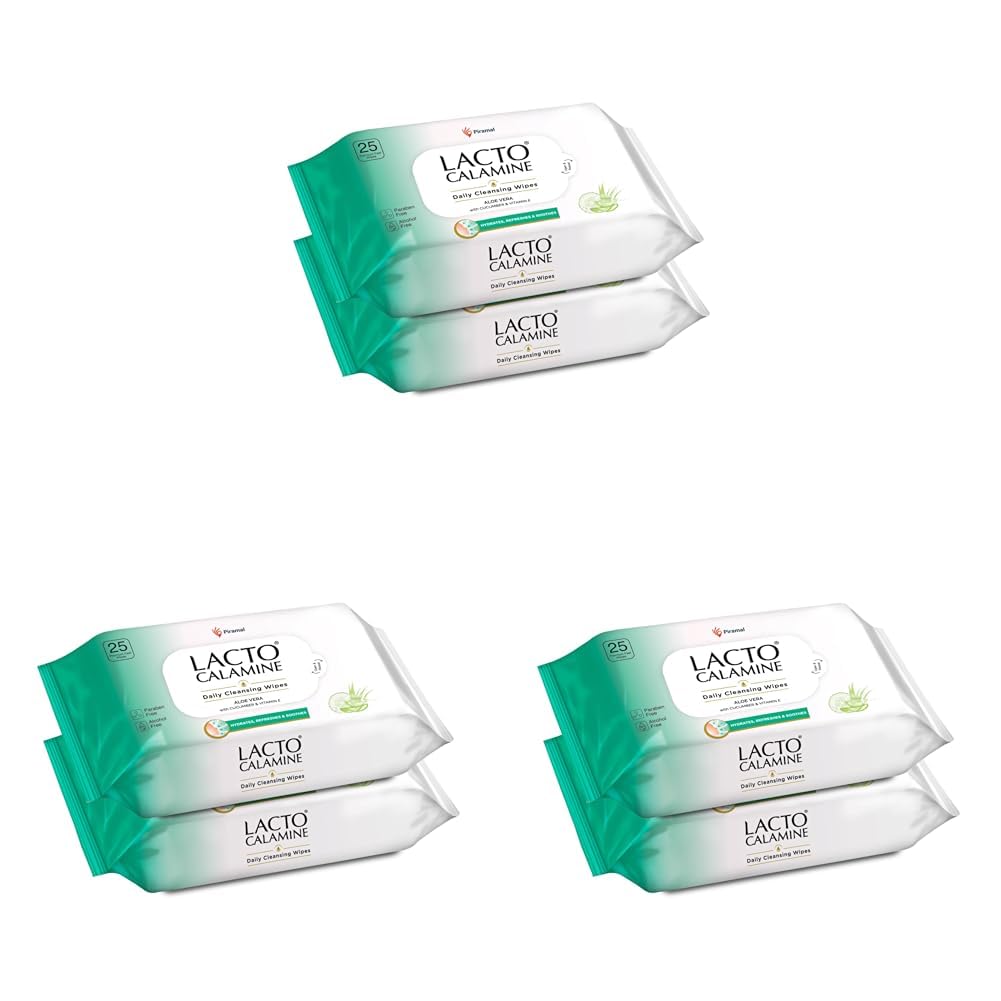 Lacto Calamine Daily Cleansing Facial Wipes 25N Each - Pack of 6 | Wet Wipes for Face with Aloe Vera Cucumber & Vitamin E | Makeup Remover Wipes| HydratingRefreshing Soothing|Paraben & Alcohol Free