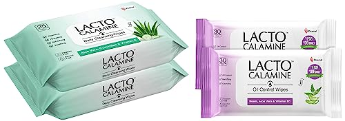 Lacto Calamine Oil Control Face Wipes with Neem Vitamin B3 and Aloe Vera No Parabens Alcohol Free White 60 Count Pack of 2LACTO CALAMINE OIL CONTROL WIPE 3in 1 formula with Neem Vitamin B3 and Aloe Vera. It keeps your skin feeling fresh and oil free. Paraben Free & Alcohol free.It gently cleanses your skin from impurities excess oil dirt & pollution giving you a clear matte look daily.Lacto Calamine Daily Cleansing Face Wipes with Aloe Vera Cucumber and Vitamin E White Pack of 2 50 CountLacto Calamine Daily Cleansing Wipes are face wipes that gently cleanse your skin from impurities dirt & pollution. Aloe Vera & Cucumber soothes and refreshes your skin while Vitamin E acts as an antioxidant protecting your skin.