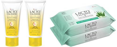 Lacto Calamine Sunscreen SPF 50 | 50g Each - Pack of 2 | PA +++ Sunscreen For Oily Skin | UVA â UVB Sunscreen | Water Resistant & No White Cast | With Kaolin Clay Vitamin E & Lemon ExtractsPacked with the goodness of a host of beneficial ingredients it will not only deliver the desired results that you expect but also care for your skinLacto Calamine Daily Cleansing Facial Wipes 25N Each - Pack of 2 | Wet Wipes for Face with Aloe Vera Cucumber & Vitamin E | Makeup Remover Wipes| HydratingRefreshing Soothing|Paraben & Alcohol FreeLacto Calamine Daily Cleansing Wipes are face wipes that gently cleanse your skin from impurities dirt & pollution. Aloe Vera & Cucumber soothes and refreshes your skin while Vitamin E acts as an antioxidant protecting your skin.