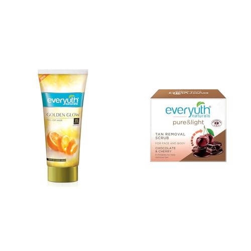 Everyuth Naturals Advanced Golden Glow Peel-off Mask 90gm TubeNow get a glowing skin is just a matter of minutes. New EverYuth Golden Glow Peel-Off comes with special glitter particules that give you instant fairness and a shimmery new look. Infused with orange extracts its unique 3-way action cleanses smoothens and nourishes your skin giving your face an instant makeover.Everyuth Naturals Pure & Light Tan Removal Choco Cherry Scrub 50Gm BottleNew everyuth naturals pure & light tan removal face & body scrub brings together an effective combination of brightening and vitamin rich cherry and luxurious detoxifying chocolate. It gently scrubs away the tanned skin cells. The skin feels smooth and looks brighter suitable for face neck and other exposed affected areas such as arms and shoulders.