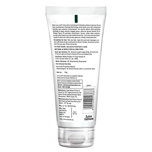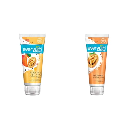 Everyuth Naturals Hydrating & Exfoliating Walnut Apricot Scrub 100gm TubeNew Everyuth naturals hydro active walnut apricot scrub has revolutionary hydrogel technology which gives your skin enhanced lubricity and superior moisturisation its natural walnut shell particles exfoliate and deep cleanse clogged pores while its apricot kernel oil provides nourishment. Hence unlike other ordinary scrubs which leave your skin stretched and dry it not only removes blackheads and dead skin cells but also gives you velvety moisturized skin.Everyuth Naturals Exfoliating Walnut Scrub 100gm TubeDon't let your beautiful skin hide under dirt and impurities! Cleanse your pores with Nano Multi Vit A and Walnut Shell Powder which scrubs away dead skin cells and gives your face a delightfully radiant glow.