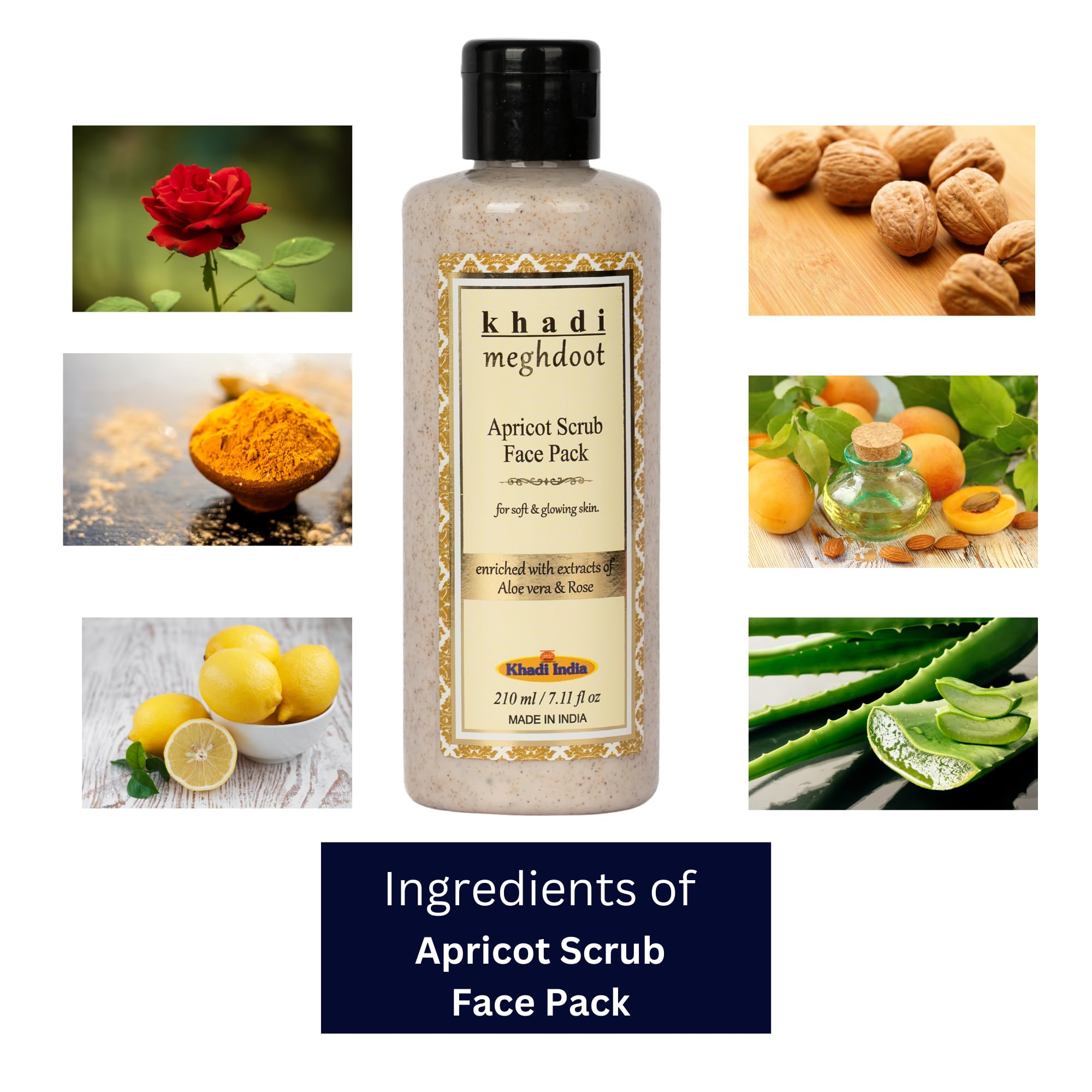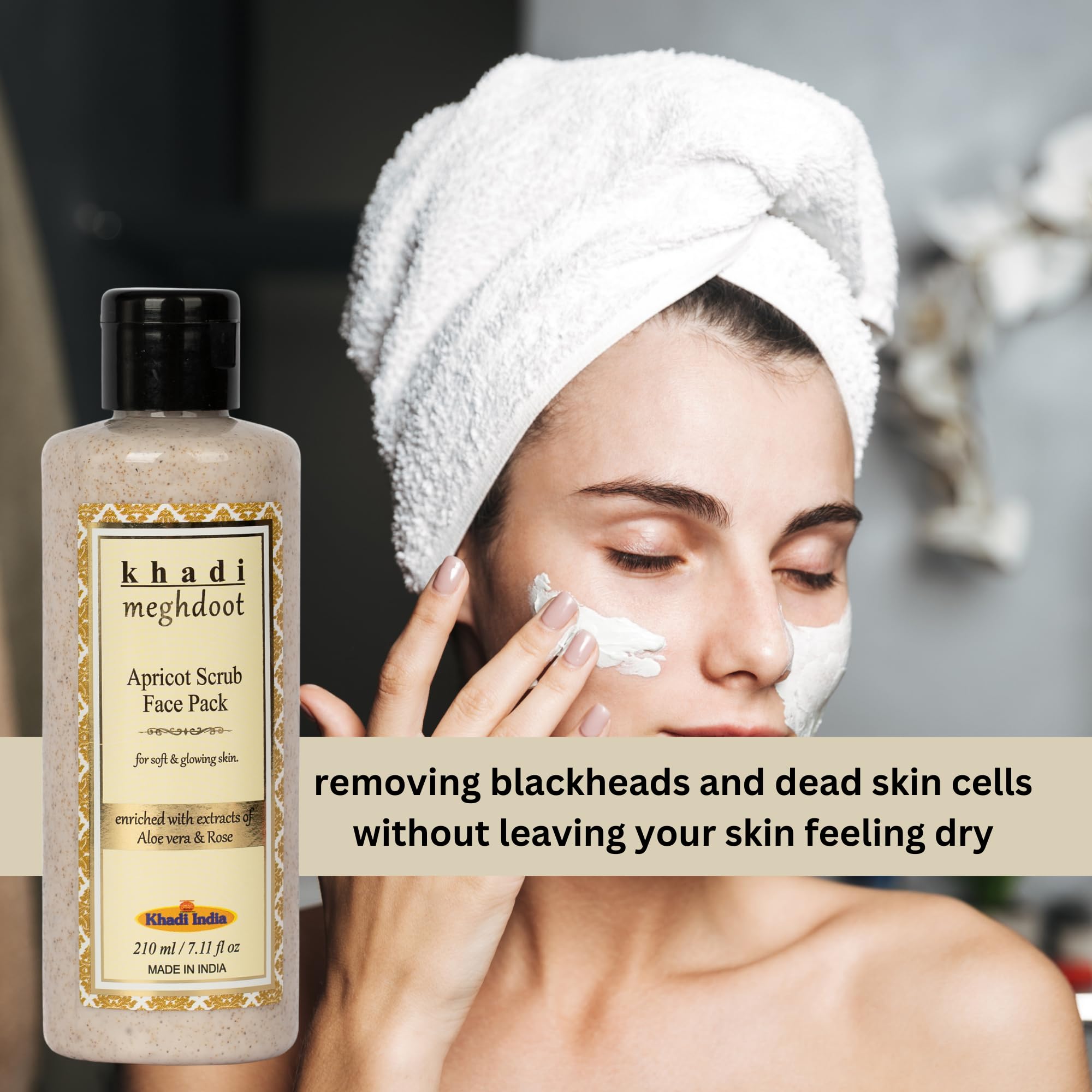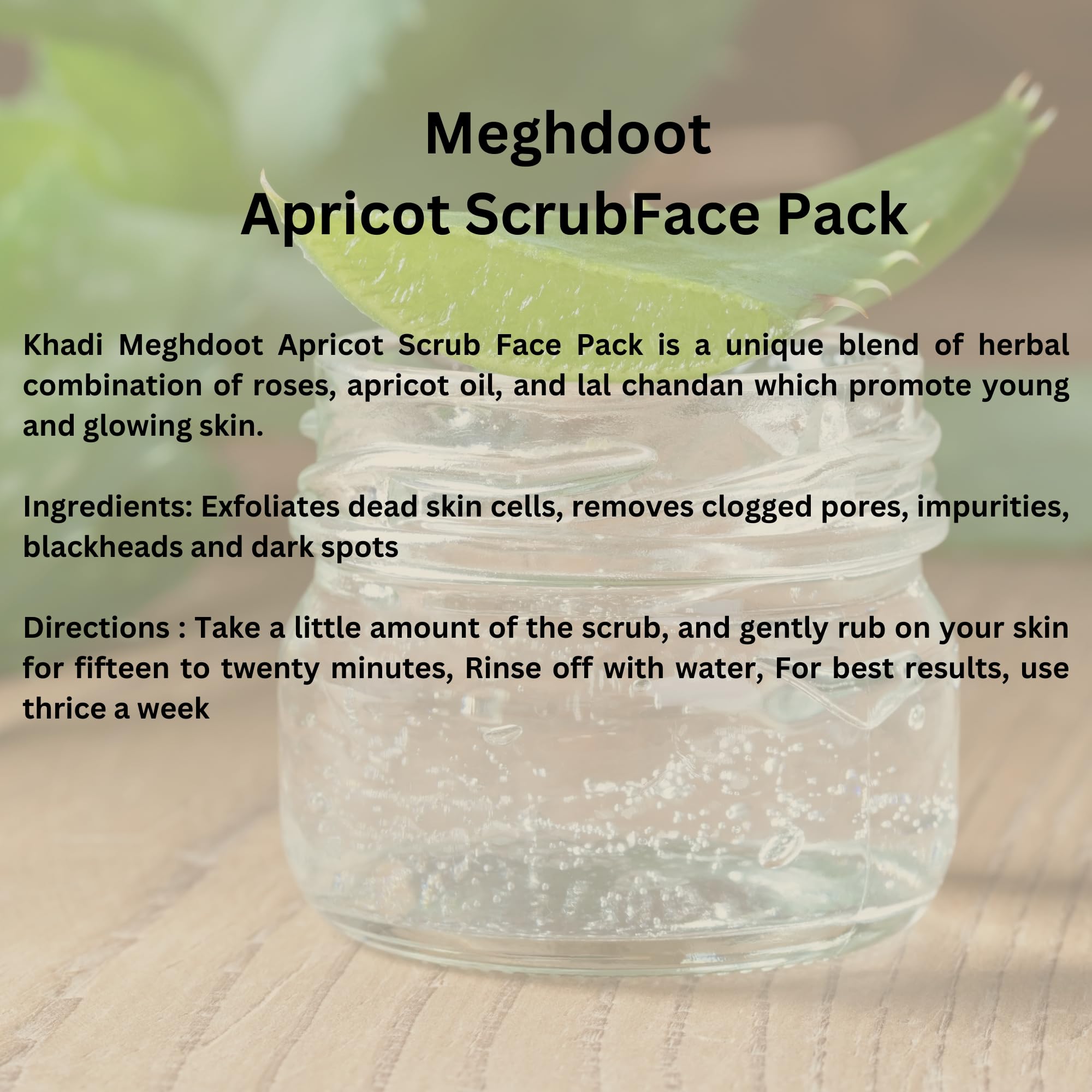 Meghdoot Blemish and Blackhead Control Apricot Face Scrub a natural exfoliating formula enriched with the goodness of apricot aloe vera and rose extract. This gentle herbal scrub removes dead skin cells unclogs pores and helps reduce blackheads and blemishes for a fresh radiant look.Aloe vera soothes and hydrates the skin while rose extract tones and refreshes. The apricot granules exfoliate effectively without causing dryness or irritation. Suitable for all skin types this scrub supports skin renewal improves texture and promotes a healthy natural glow. Ideal for both men and women and safe for regular use.100% natural exfoliants (like walnut shell powder) and apricot fruit extract leave skin feeling super soft and smooth. Face scrubs formulated with apricot kernels promote new skin growth by ridding the skin of the old dead cells on the surface.100% natural exfoliants (like walnut shell powder) and apricot fruit extract leave skin feeling super soft and smooth. Face scrubs formulated with apricot kernels promote new skin growth by ridding the skin of the old dead cells on the surface.
