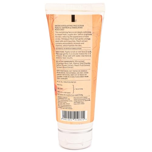 A revitalizing face scrub with peach extract saffron flower extract and micronized Himalayan rock salt. Saffron brightens the skin diminishing the appearance of dark circles and fine lines. Himalayan rock salt helps to remove dead cells and impurities and reduces spots pimples face blemishes and other skin imperfections encouraging the appearance of fresh skin.
