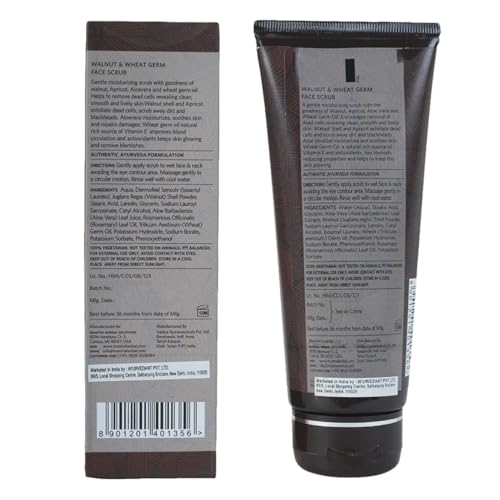 Gentle moisturizing scrub with goodness of walnut apricot aloe Vera and wheat germ oil. Helps to remove dead cells revealing clean smooth and lively skin. Walnut shell and apricot exfoliate dead cells scrub away dirt and blackheads. Aloe Vera gel moisturizes soothes skin and repairs damages. Wheat germ oil natural rich source of vitamin e improves blood circulation and antioxidants keeps skin glowing and remove blemishes.