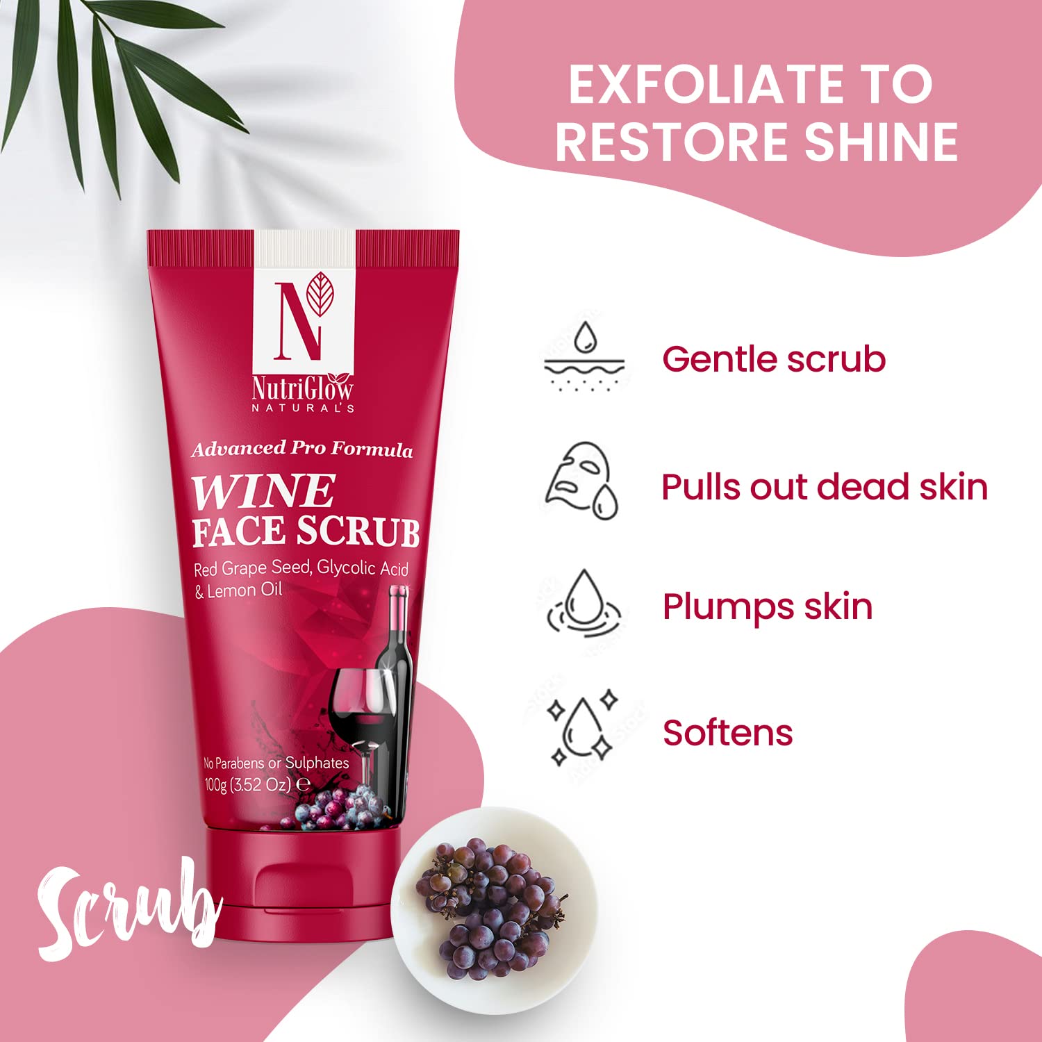 An exfoliator that is made using all 100% natural ingredients fits all skin types and gives a natural glow. It is infused with the rich extracts of red grape seed in granules to remove dead skin from your face and glycolic acid which will help lift the skin by reducing wrinkles and dark spots. The lemon oil will ensure to cure acne conditions fight bacterias sitting on your face and repairs skin cell. This exclusive combination of essential natural scrubbing elements will lighten the suntan to make you achieve a bright skin complexion. It is free of sulfates harsh scrubbers and parabens which is a win-win situation for all the individuals concerned about using chemical-free products. The red grape seed will not only eliminate the blackheads off your skin but also tighten the pores to prevent further blackheads development. You can expect to improve the skin texture with every use of this fantastic wine face scrub. We at Nutriglow believe in contributing toward a healthy environment so the products are manufactured while giving a top priority to nature which makes us cruelty-free eco-friendly and vegan-friendly. You can apply this amazing exfoliator on a damp face and neck area directly with the help of your fingertips. Now gently start scrubbing in the circular motion focusing on your T-zone and sides of the nose. Keep scrubbing for not more than 1-2 minutes and wash it off using lukewarm water. You can follow it up with a moisturizer or a face pack. Make sure to avoid eye contact as it could lead to irritation; gently scrub using light pressure on the face if you have sensitive skin.