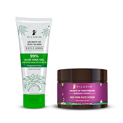 Pilgrim Red Vine Skin Hydration & Smoothening Combo | Anti Aging Facial Combo | 99% Aloe Vera Gel 200ml | Red Vine Face Scrub 50gm | All Skin Type| Facial Combo for Men & Women