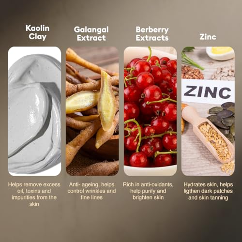 • It contains kaolin clay helps prevent clogging of pores and draws out excess oil toxins and impurities from the skin.