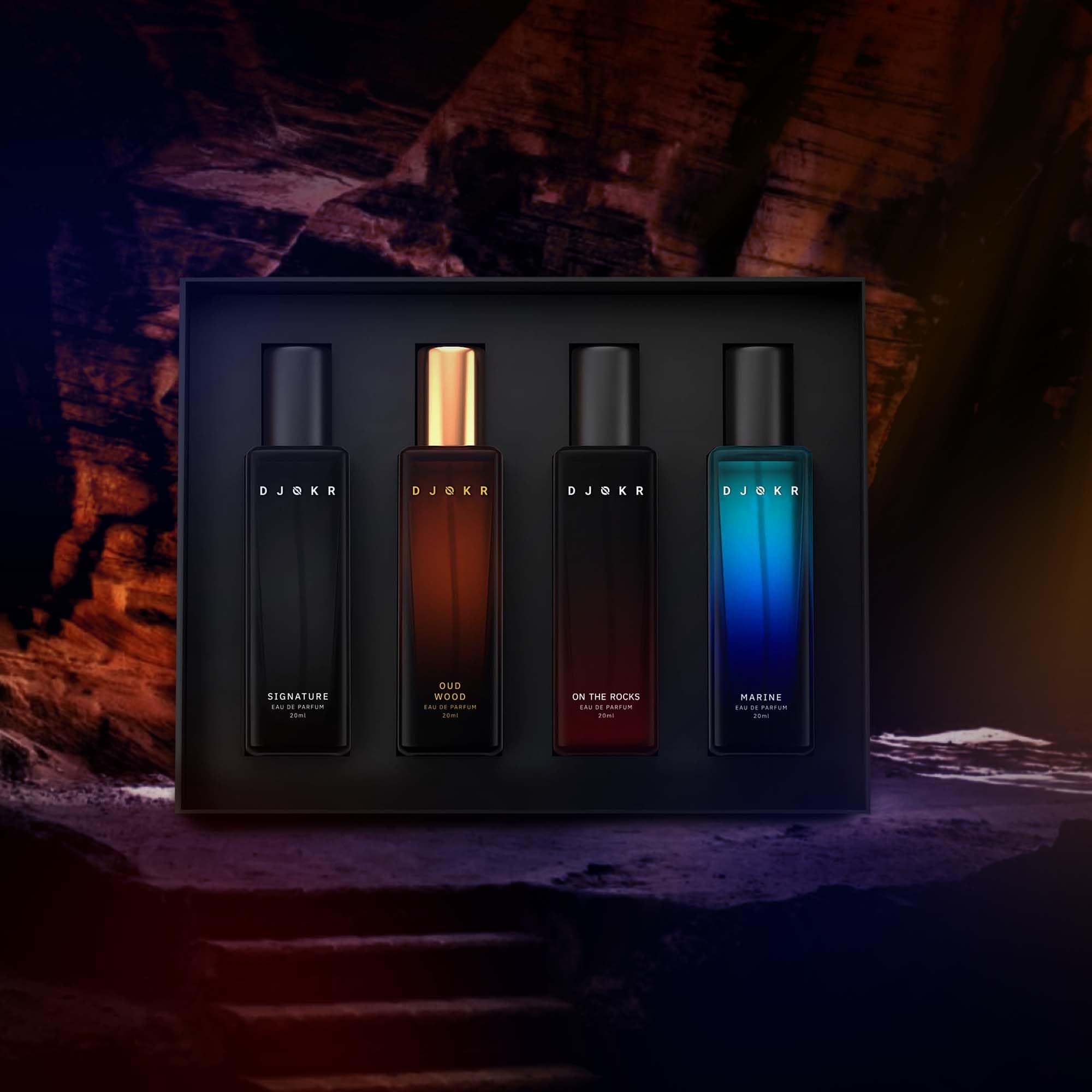 DJOKR set of 4 perfumes comes with 4 luxury fragrances DJOKR Signature DJOKR On The Rocks DJOKR Oud Wood and DJOKR Marine.