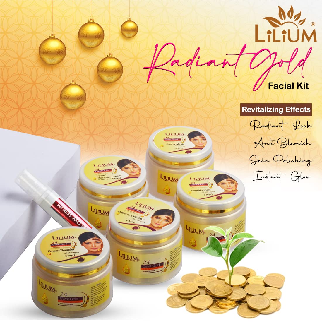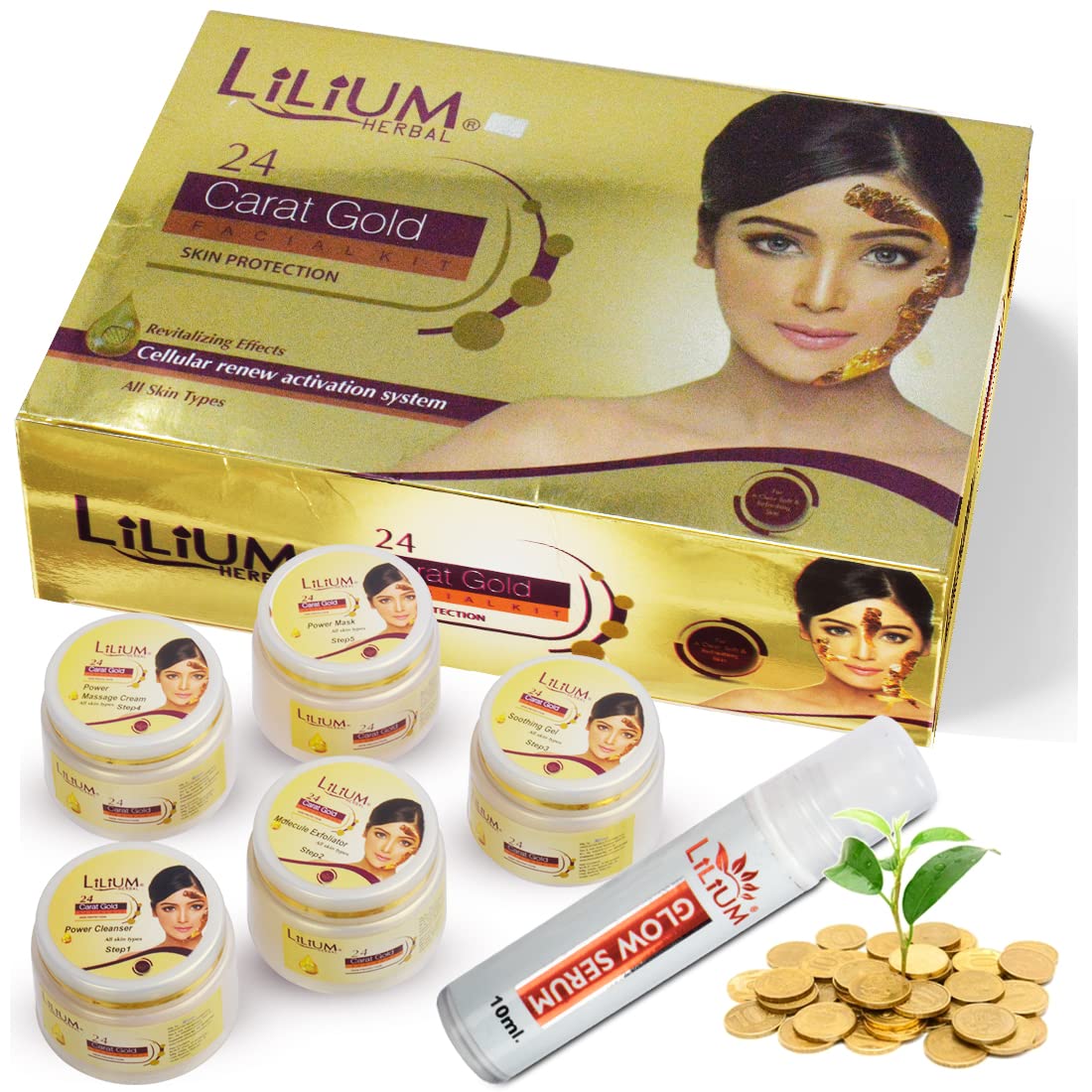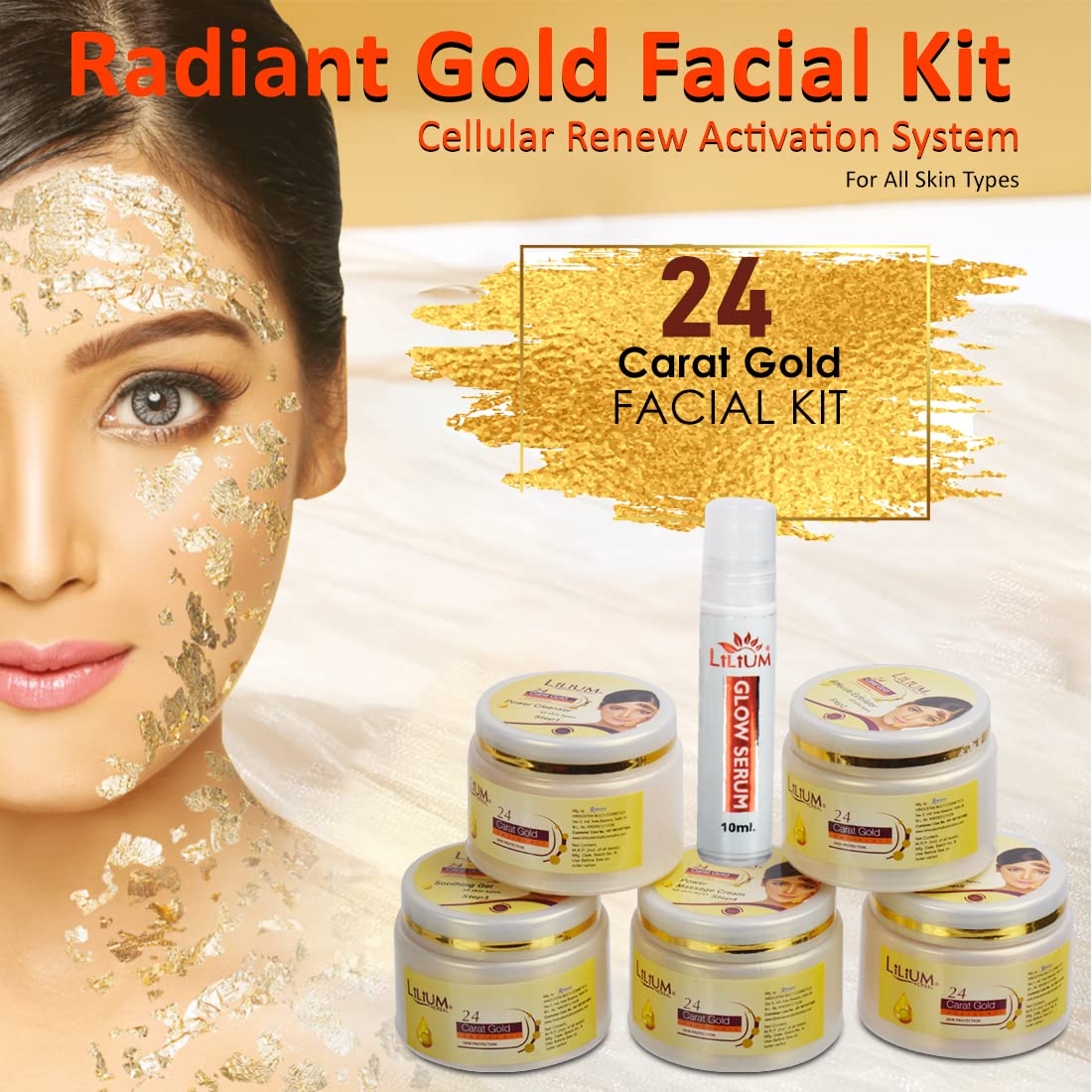 Good Choice India provides you 100% genuine & brand new product...The Lilium "24 Carat Gold Facial Kit" fortified with Actives is a complete "Do it yourself" Facial Kit that can be used at the comfort of your home. In today’s day and age exposure to Sun Pollution and Impurities in our surroundings leaves our skin dull dark and lifeless! Maintaining good skin health is the top most priority for all of us! "24 Carat Gold Facial Kit" helps tackle these skin concerns. Contains gold dust &carrot seed oil. Gold carries anti inflammatory properties it protects the skin from allergies. Gold revitalizes the skin. Carrot for all skin types (Preferably dull lusterless & tired skin). It enhances skin temperature thereby boosting blood circulation it gives gold like shine & luster to skin. Contains gold dust &carrot seed oil. Gold carries anti inflammatory properties it protects the skin from allergies. Gold revitalizes the skin. Carrot for all skin types (Preferably dull lusterless & tired skin). It enhances skin temperature thereby boosting blood circulation it gives gold like shine & luster to skin. Enriched with the concoction of Activated with natural ingredients that are fortified with Actives delivers maximum efficacy with skin rejuvenation benefits for a purified balanced and glowing skin!