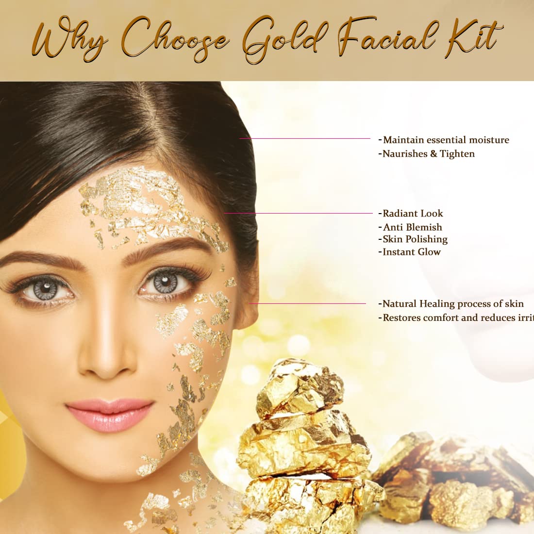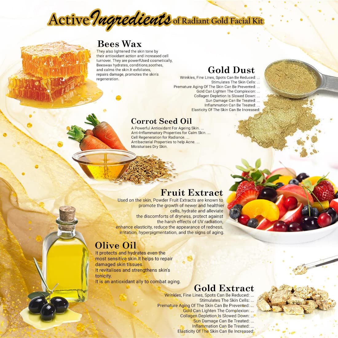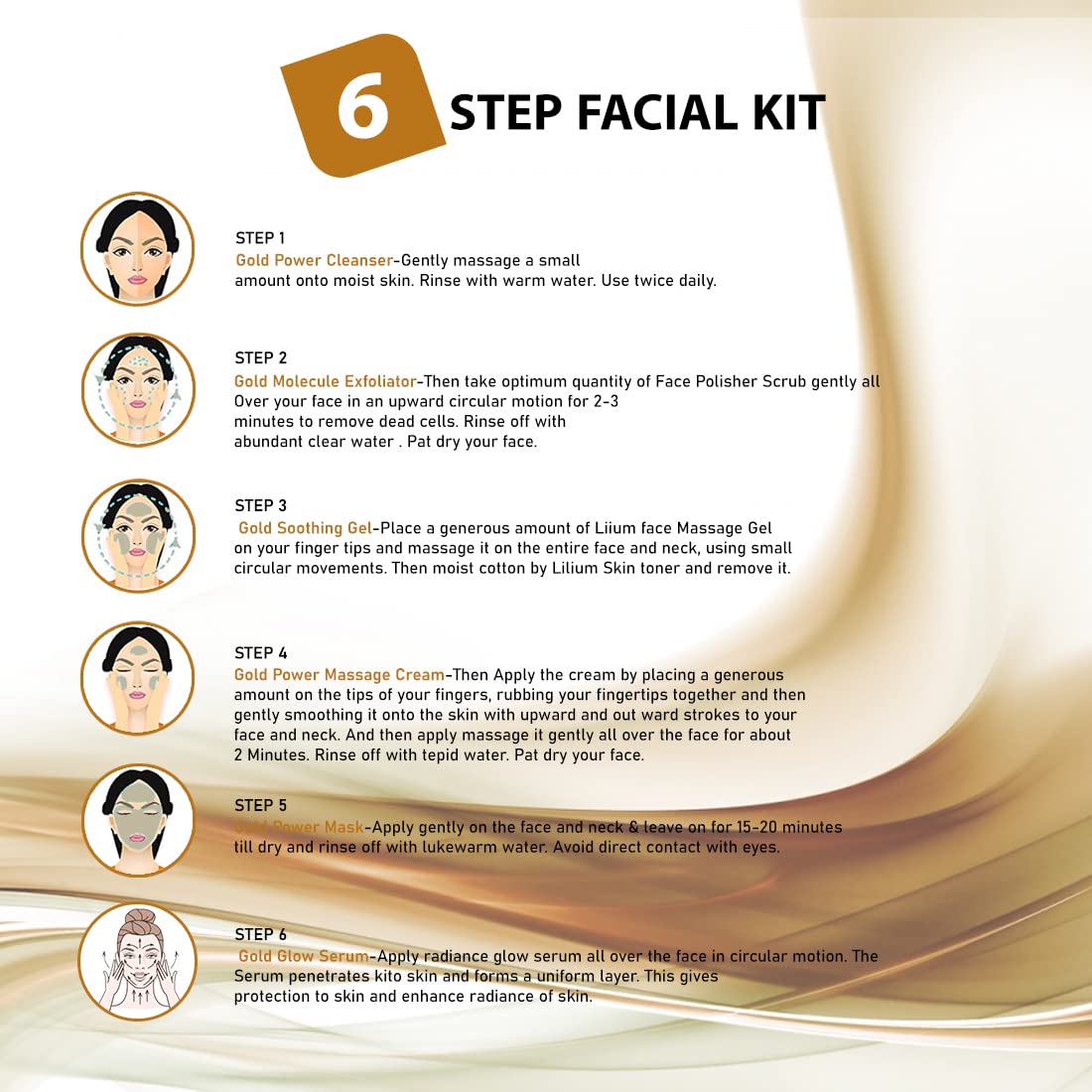 Good Choice India provides you 100% genuine & brand new product...The Lilium "24 Carat Gold Facial Kit" fortified with Actives is a complete "Do it yourself" Facial Kit that can be used at the comfort of your home. In today’s day and age exposure to Sun Pollution and Impurities in our surroundings leaves our skin dull dark and lifeless! Maintaining good skin health is the top most priority for all of us! "24 Carat Gold Facial Kit" helps tackle these skin concerns. Contains gold dust &carrot seed oil. Gold carries anti inflammatory properties it protects the skin from allergies. Gold revitalizes the skin. Carrot for all skin types (Preferably dull lusterless & tired skin). It enhances skin temperature thereby boosting blood circulation it gives gold like shine & luster to skin. Contains gold dust &carrot seed oil. Gold carries anti inflammatory properties it protects the skin from allergies. Gold revitalizes the skin. Carrot for all skin types (Preferably dull lusterless & tired skin). It enhances skin temperature thereby boosting blood circulation it gives gold like shine & luster to skin. Enriched with the concoction of Activated with natural ingredients that are fortified with Actives delivers maximum efficacy with skin rejuvenation benefits for a purified balanced and glowing skin!