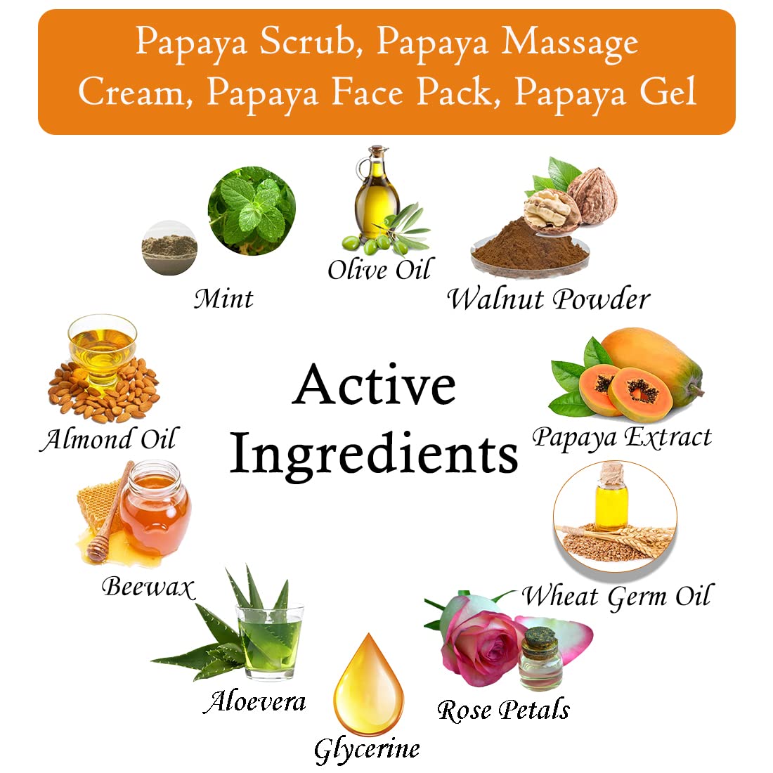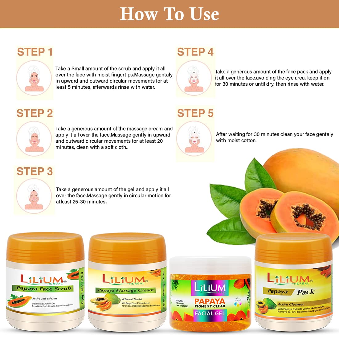 Face Scrub: Papaya facial scrub is mild and pH-balanced to gently deep cleanse your pores of impurities while keeping your skin moisturized. It contains Papaya Extract to keep skin supple and reduce the appearance of wrinkles and fine lines and Pearl Protein helps even out your skin tone for best results combine with other products from Lilium Papaya Range.Massage Cream: Typically created with soothing Papaya Extract Massage cleanser penetrate pores to clear out dirt lift away pore clogging dust and excess oil. Makes skin clean smooth and healthy looking and get Fresh and Flawless Fairer Skin.Face Gel: Lilium papaya gel promotes skin renewal repair and cell turnover for rejuvenation & total nourishment. Alpha hydroxyl acids in papaya gel or most effective as anti-aging ingredients. Effective against pigmentation and Acne.Face Pack: Papaya face pack being a good source of vitamin A and Papain this fruit helps in removing dead skin cells along with breaking down the inactive proteins. Lilium Herbal papaya face pack is its Low Sodium Quality thus resulting in very little retention of water. In simple words it means it helps you to keep your skin hydrated. Papaya is also fruitful for treating the dark spots of skin.