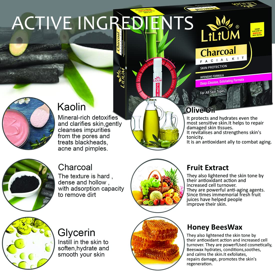 Buy this Product From The House Of Good Choice India on Amazon.in The Lilium Facial Kit" fortified with Actives is a complete "Do it yourself" Facial Kit that can be used at the comfort of your home. In today’s day and age exposure to Sun Pollution and Impurities in our surroundings leaves our skin dull dark and lifeless! Maintaining good skin health is the top most priority for all of us! This Facial Kit" helps tackle these skin concerns. Enriched with the concoction of Activated with natural ingredients that are fortified with Actives delivers maximum efficacy with skin rejuvenation benefits for a purified balanced and glowing skin! This kit is suitable for skin types.