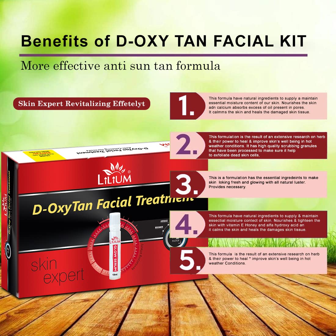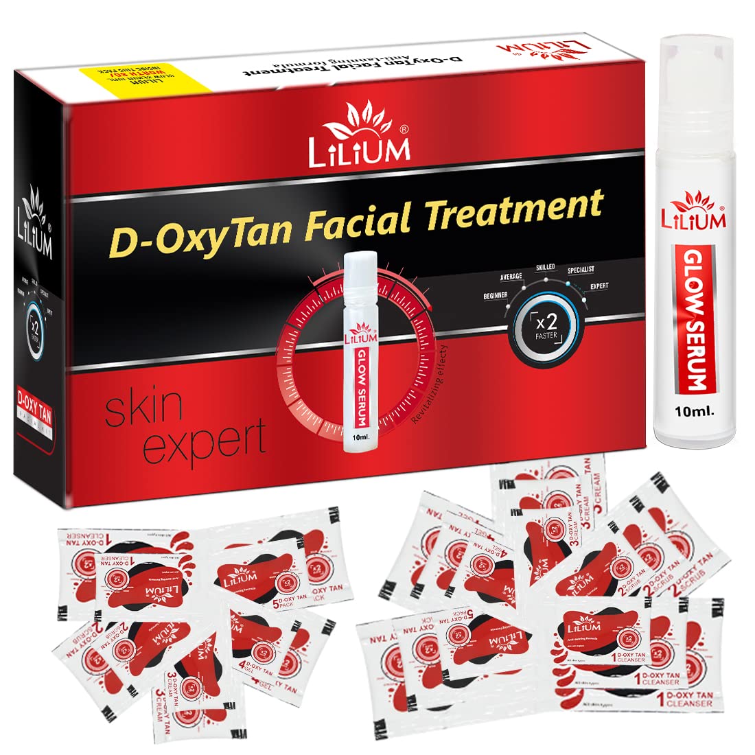 Buy this Product From The House Of Good Choice India on Amazon.in The Lilium D-Oxy Tan Facial Kit" fortified with Actives is a complete "Do it yourself" Facial Kit that can be used at the comfort of your home. In today’s day and age exposure to Sun Pollution and Impurities in our surroundings leaves our skin dull dark and lifeless! Maintaining good skin health is the top most priority for all of us! D-Oxy Tan Facial Kit" helps tackle these skin concerns. Enriched with the concoction of Activated with natural ingredients that are fortified with Actives delivers maximum efficacy with skin rejuvenation benefits for a purified balanced and glowing skin! This kit is suitable for skin types.