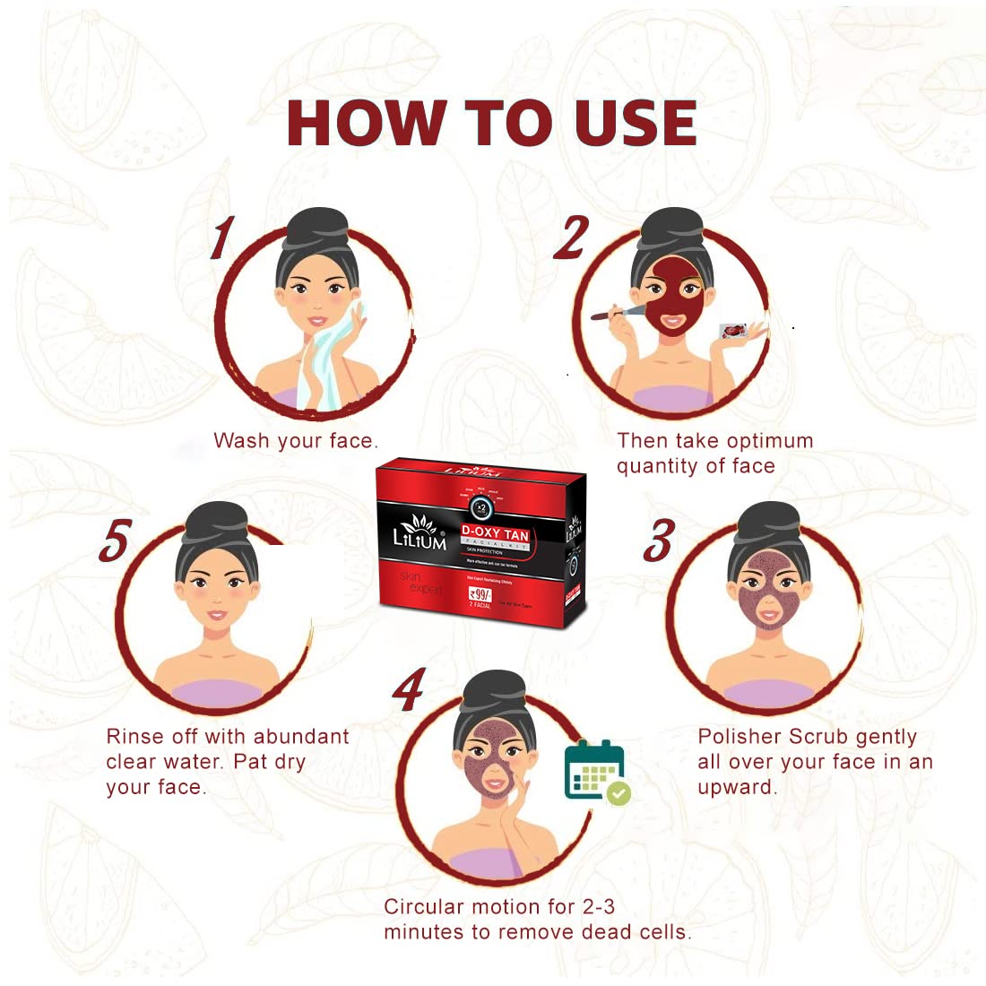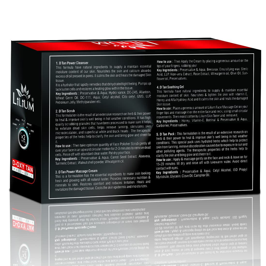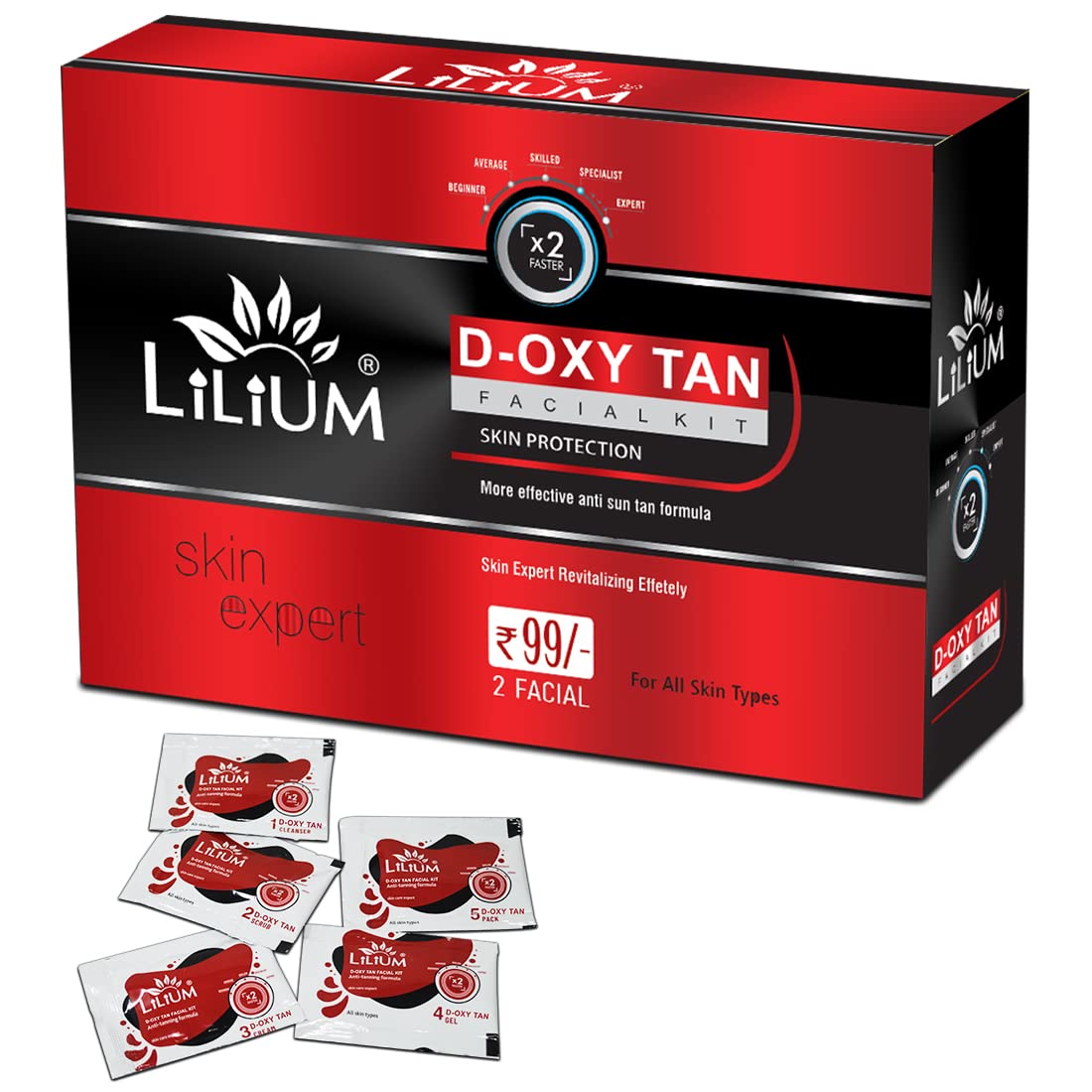 Buy this Product From The House Of Good Choice India on Amazon.in The Lilium D-Oxy Tan Facial Kit" fortified with Actives is a complete "Do it yourself" Facial Kit that can be used at the comfort of your home. In today’s day and age exposure to Sun Pollution and Impurities in our surroundings leaves our skin dull dark and lifeless! Maintaining good skin health is the top most priority for all of us! D-Oxy Tan Facial Kit" helps tackle these skin concerns. Enriched with the concoction of Activated with natural ingredients that are fortified with Actives delivers maximum efficacy with skin rejuvenation benefits for a purified balanced and glowing skin! This kit is suitable for skin types.