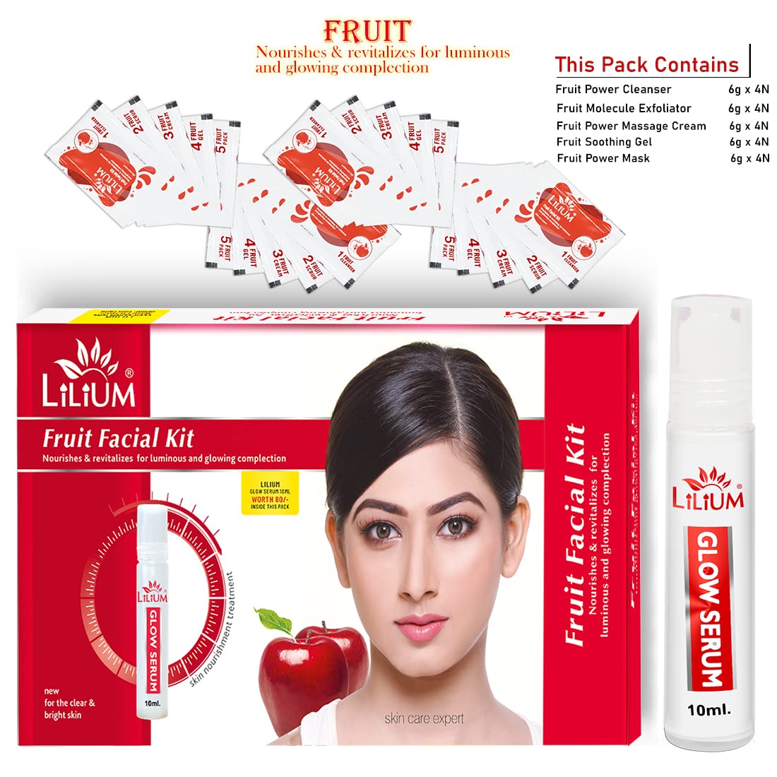 Buy this Product From The House Of Good Choice India on Amazon.in The Lilium Fruit Glow Facial Kit" fortified with Actives is a complete "Do it yourself" Facial Kit that can be used at the comfort of your home. In today’s day and age exposure to Sun Pollution and Impurities in our surroundings leaves our skin dull dark and lifeless! Maintaining good skin health is the top most priority for all of us! Fruit Glow Facial Kit" helps tackle these skin concerns. Enriched with the concoction of Activated with natural ingredients that are fortified with Actives delivers maximum efficacy with skin rejuvenation benefits for a purified balanced and glowing skin! This kit is suitable for skin types.