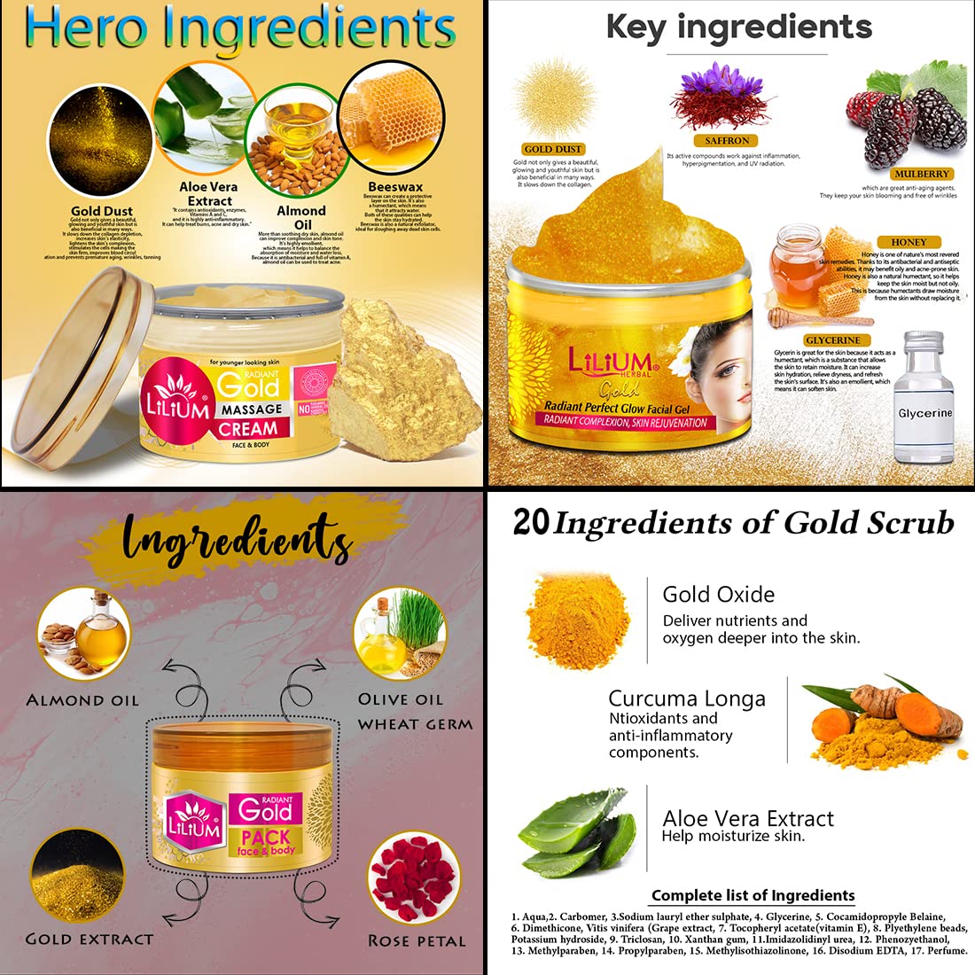 [BRIGHTENING EFFECT] Gold particles reflect light giving the skin a radiant and luminous appearance. Over time consistent use of a gold facial kit helps to fade dark spots hyperpigmentation and other discolorations leading to a more even and radiant compl