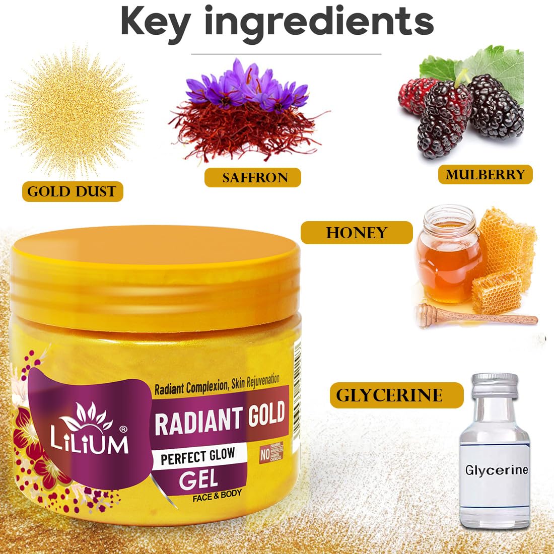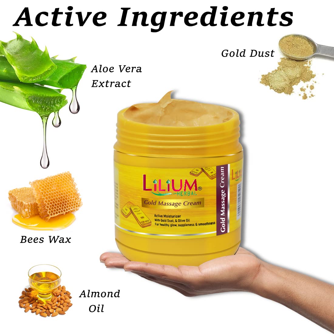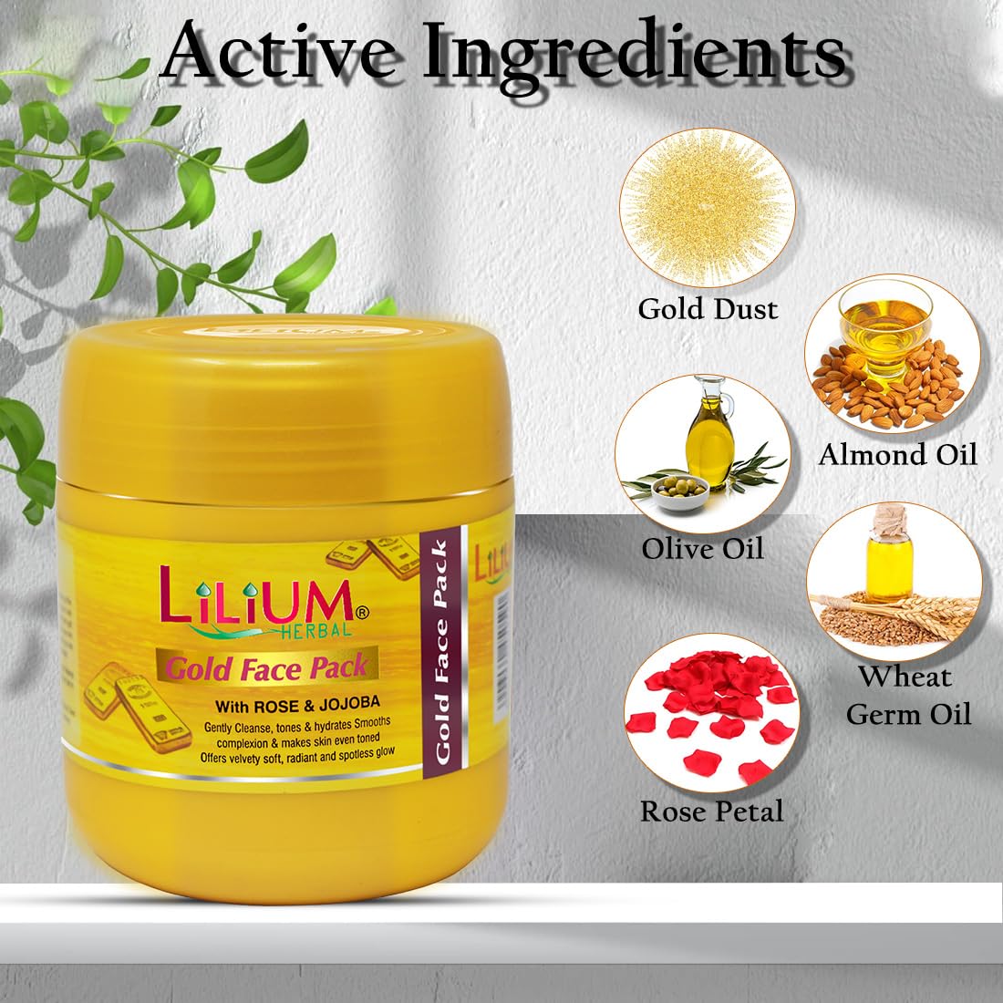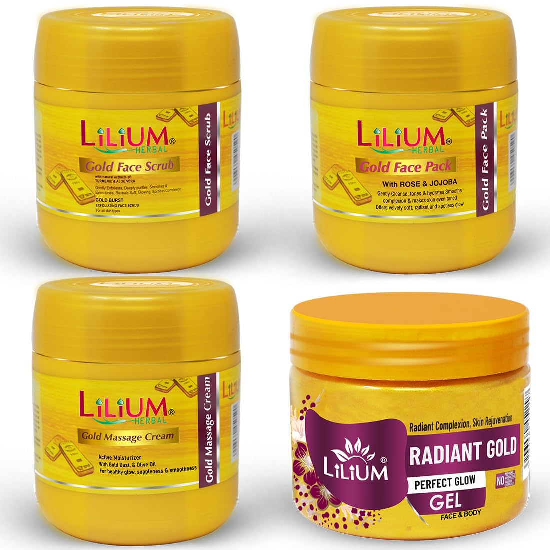 Face Scrub: Gold facial scrub is mild and pH-balanced to gently deep cleanse your pores of impurities while keeping your skin moisturized. It contains Nano-Gold 24k Technology to keep skin supple and reduce the appearance of wrinkles and fine lines and Pearl Protein helps even out your skin tone. For best results combine with other products from Lilium Gold Range.Massage Cream: 24 Caret Glow Gold massage cream maintain the fairness glow and shining of the skin it gives a natural lustre and youthful radiance to the skin use of gold in skin care dates back to ancient times. Ancient Ayurveda scriptures claims that gold Imparts radiance to the skin even has anti-aging powers. It will help your skin similar to that of gold. The skin is also revitalized by regular use of the product.Face Gel: Lilium Gold Gel know for skin lightening properties saffron & mulberry is used as natural fairness enhancing ingredient since ages. It’s an anti-aging gel which helps reduce wrinkle & fine lines.Face Pack: Perfect blend of gold which is suitable for all types of skin which removed the impurities of skin which removed the impurities of skin and clean the clogged pores and nourish tightening and revitalizing the facial tissue and make flawless fairer skin.