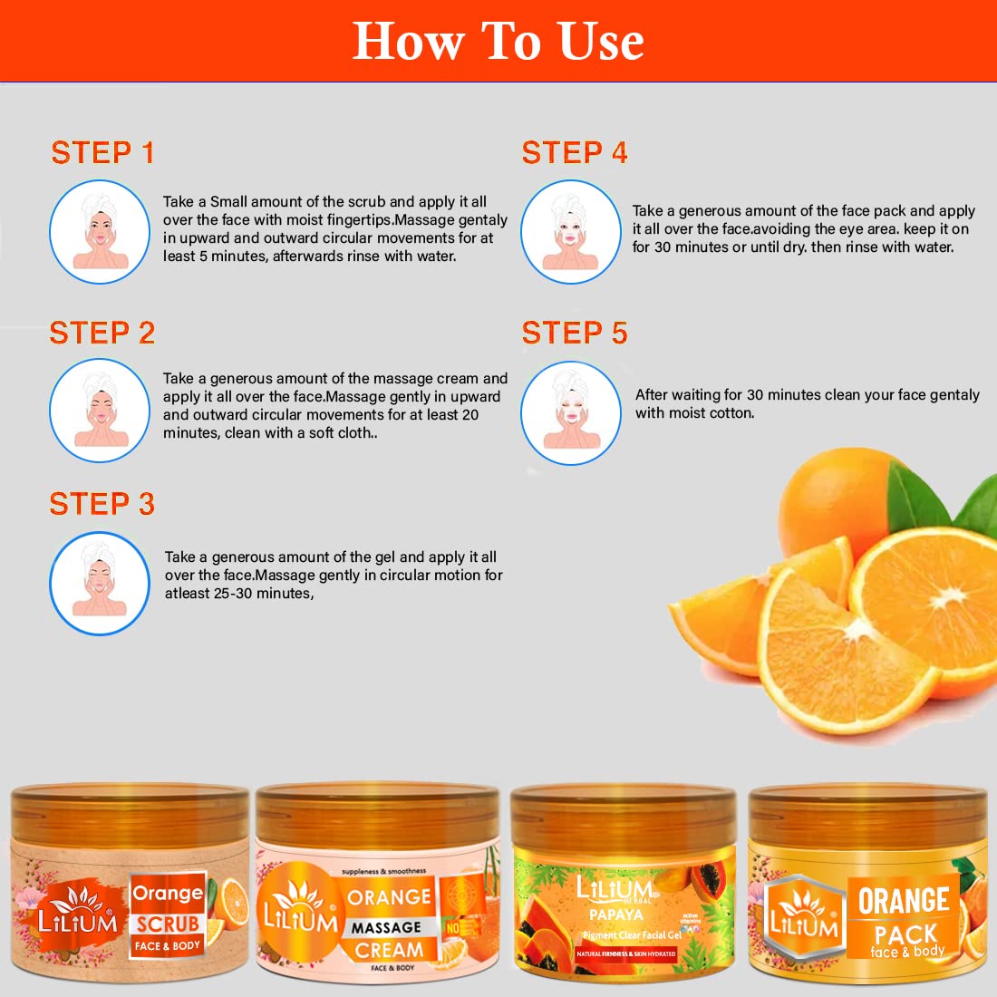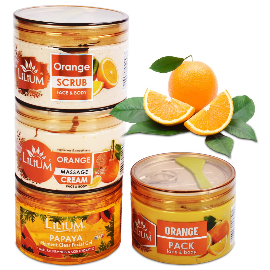 Face Scrub: Lilium Orange facial scrub is mild and pH-balanced to gently deep cleanse your pores of impurities while keeping your skin moisturized. It contains Orange Extract to keep skin supple and reduce the appearance of wrinkles and fine lines and Pearl Protein helps even out your skin tone. For best results combine with other products from Lilium Orange Range.Massage Cream: Orange massage cream maintain the fairness glow and shine of the skin. It gives a natural lustre and youthful radiance to the skin. The use of orange in skin care dates back to ancient times. Ancient ayurvedic scriptures claims that orange imparts radiance to the skin and even has anti-aging powers. It will help your skin breathe and look best. The lustre on your skin will be similar to that of orange. The skin is also revitalized by regular use of the product.Face Gel: Lilium Papaya Gel promotes skin renewal repair and cell turnover for rejuvenation & total nourishment. Alpha Hydroxy Acids in papaya gel or most effective as anti-aging ingredients. Effective against pigmentation and Acne.Face Pack: Perfect blend of Orange suitable for all skin types. This face pack removes the impurities of the skin and cleans clogged pores. It nourishes tightens and revitalizes the facial skin giving you flawless fairer skin.