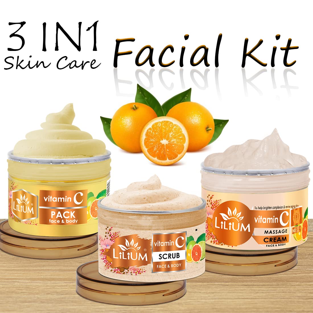Scrub: Vitamin C facial scrub is mild and pH-balanced to gently deep Cleanse your pores of impurities while keeping your skin moisturized. It contains Orange Extract & Lemon Extract to keep skin supple and reduce the appearance of wrinkles and fine lines and pearl Protein helps even out your skin tone. For best results combine with other Products from Lilium Vitamin C Range. Pack: Vitamin C Pack suitable for at skin types This face pack removes the impurities of the skin and cleans clogged pores. It nourishes tightens and revitalizes the facial skin giving you flawless fairer skin. Massage Cream: Vitamin C massage cream maintain the fairness glow and shine of the skin. It gives a natural lustre and youthful radiance to the skin. The use of orange & lemon in skin care dates back to ancient times Ancient a ayurvedic scriptures claims that orange imparts radiance to the skin and even has anti-ageing powers. It will help your skin breathe and look best. The lustre on your skin will be similar to that of orange. The skin is also revitalized by regular use of the product.
