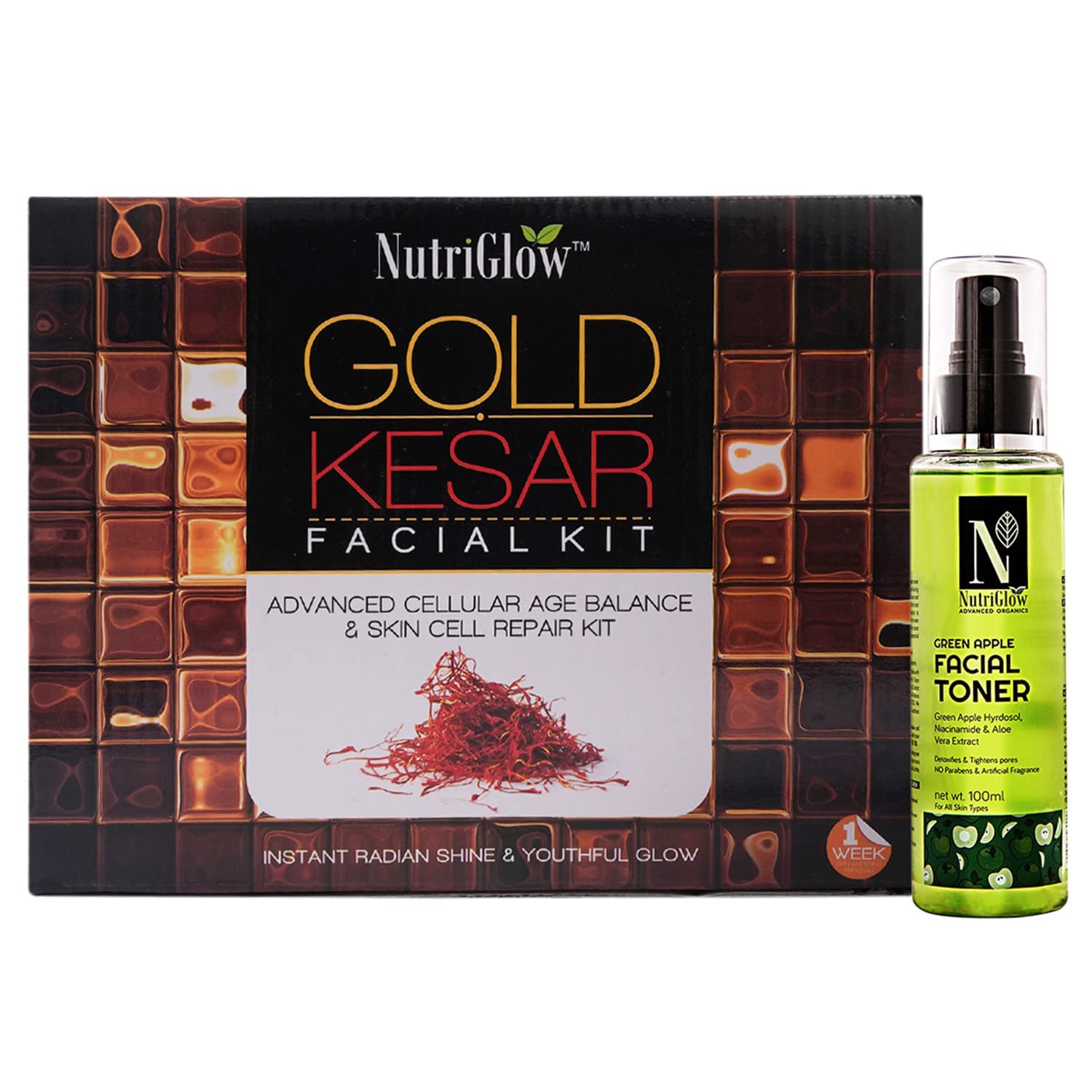 NutriGlow Gold Kesar Facial Kit (250gm+10ml) For Acne & Pimple Blemishes Treatment & Green Apple Toner (100ml) Hydrating Radiant Skin Paraben & Sulphate Free Pack of 2