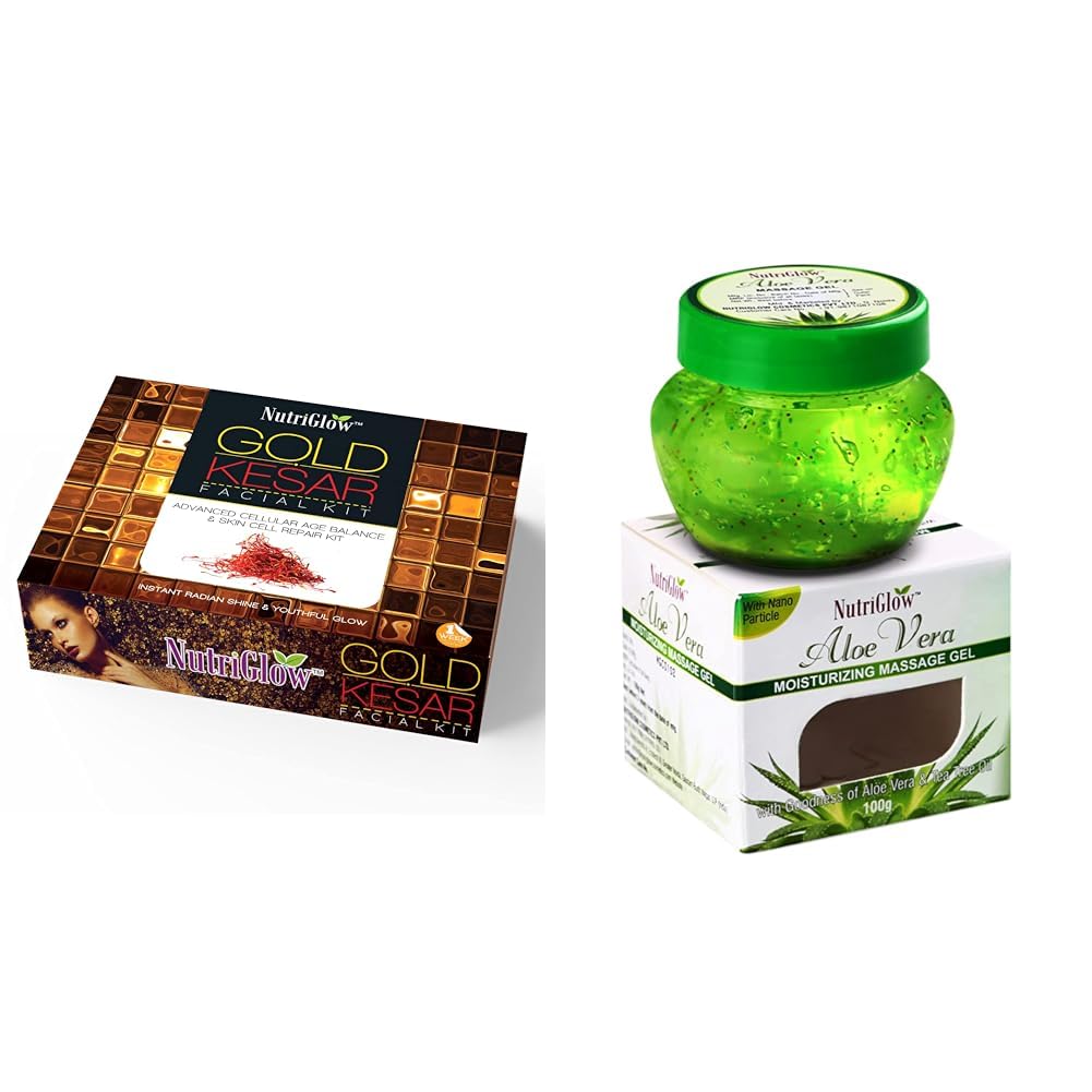 NutriGlow Gold Kesar Facial Kit for Women| 6-Piece Skin Care/Skin Cleanup Set | Targets Signs of Aging | 250g + 10mlNutriGlow Gold Kesar Facial Kit contains Gold Kesar Deep Cleanser-50g Gold Kesar Exfoliation Scrub-50g Gold Kesar Nourishing Gel-50g Gold Kesar Whitening Cream-50g Gold Kesar Firming Mask Pack-50g & Gold Kesar Serum-10ml which maintains skin balance & repairs damaged skin cells. The ingredients that cannot praise the natural beauty are worthless. In order to make you stand out in the crowd we have included the finest gold dust particles & Kesar extracts that will give you that instantly glowing face that you might have discovered on a silver screen. Our Gold Kesar Kit which encourages the nuances of your natural beauty to shine is a blend of natural ingredients that: Brightens & Whitens Dark Spots Makes Skin Glowing & Vibrant Encourages Acne & Blackhead Free Skin Great for Dry & Oily Skin ?Brightens Skin to Make You Look Young- Everyone wants to look half their age in today's world. However the tension from our surroundings keeps us binding all the time which increases the visible signs of ageing. Our facial kit is capable to reduce such signs from its very first usage that also allows you to regain confidence in the outer world while brightening & whitening the dark complexion. ?Spotless Face & Improved Radiance- The inclusion of Gold Kesar Deep Cleanser & Exfoliation Scrub in our facial kit gently eradicates grime from your face which improves skin radiance & makes you look younger & beautiful to complement your inner grace.NutriGlow Aloe Vera Gel Great for Face Hair Acne Sunburn Bug Bites Rashes Glowing and Radiant Skin Hydrating Gel Relieves Itchy & Irritated Skin Non Sticky 100gmPamper your skin and hair with NutriGlow Aloe Vera gel the purest and the finest you can get in a bottle. Guaranteed 99 percent pure NutriGlow Aloe Vera gel has been hygienically extracted from ripe robust and succulent aloe vera leaves and packaged with care to retain its natural healing and rejuvenating goodness. Aloe vera has been used for thousands of years for beauty and medicinal benefits across cultures. Aloe vera is loaded with over 75 beneficial nutrients like vitamins enzymes minerals and amino acids. When applied topically on the skin it inhibits microbes and germs moisturizes skin. Similarly when applied to hair and scalp it conditions and protects hair from dryness and damage.
