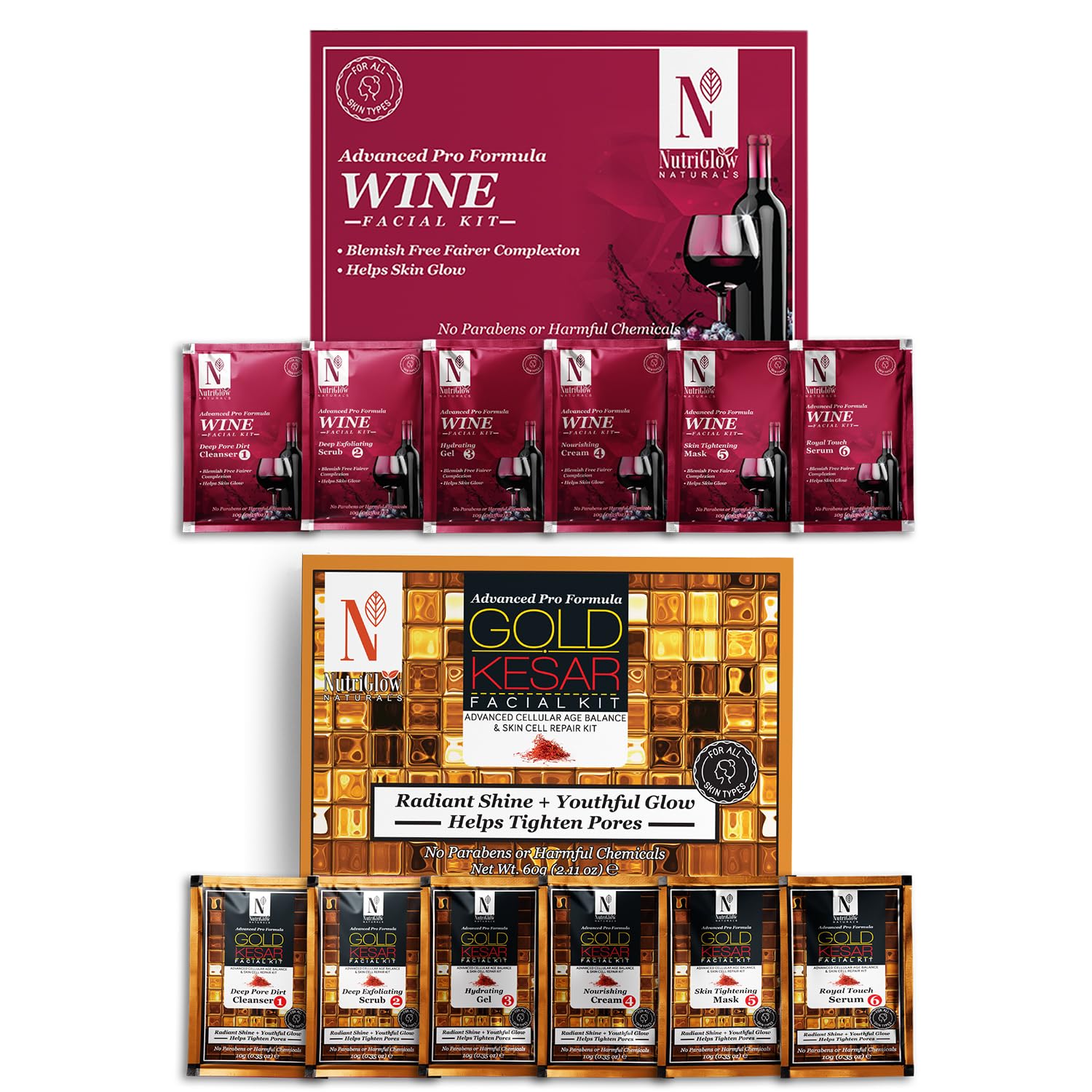 HomeBeautyFace CareFacial KitsNutriGlow NATURAL'S Advance Pro Formula Wine & Gold Kesar Facial Kit For Radiance Shine Youthfull Glow & Skin Cell Repair Kit - 60gm Each 2 x 60 g