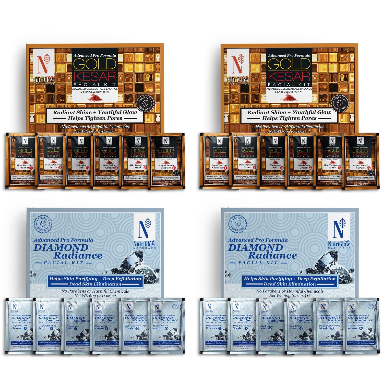 NutriGlow NATURAL'S Advanced Pro Formula Combo Pack of 4 Gold Kesar Facial Kit & Diamond Radiance Facial Kit 60gm Each for Skin Cell Repair Reduce Pigmentation