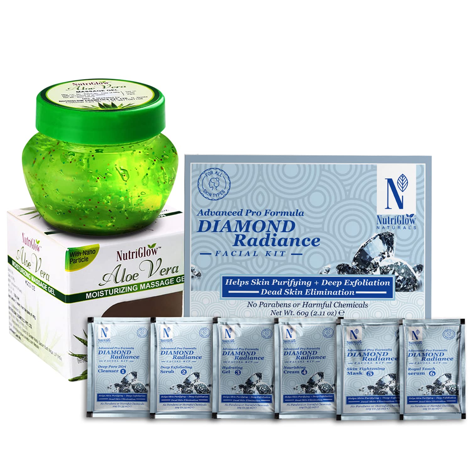 NutriGlow NATURAL'S Advanced Pro Formula Diamond Radiance Facial Kit (60gm) and Aloe Vera Massage Gel (100gm) for Skin Hydrating & Moisturize Pack of 2