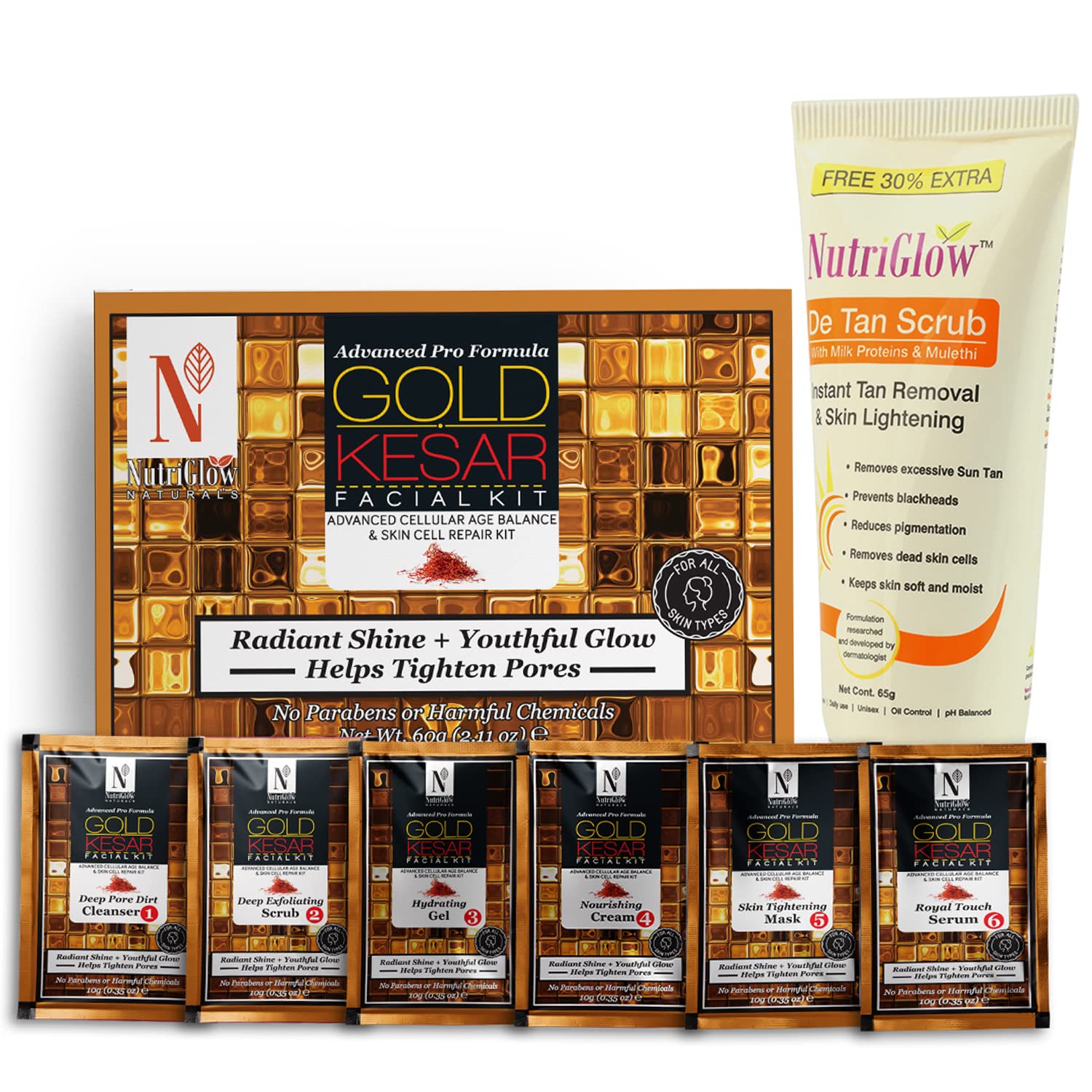 HomeBeautyFace CareFacial KitsNutriGlow NATURAL'S Advanced Pro Formula Gold Kesar Facial Kit (60gm) and De Tan Scrub (65gm) for Instant Tan Removal & Skin Lightening Pack of 2