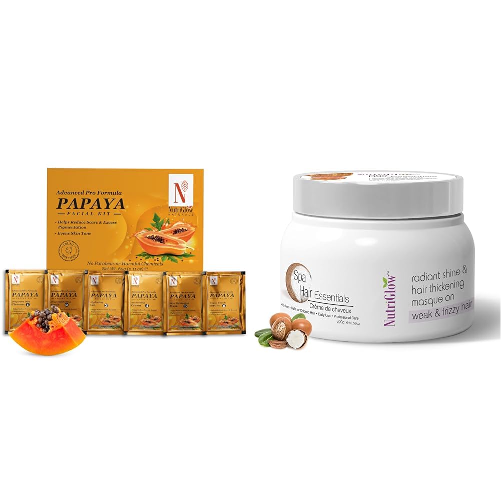 NutriGlow NATURAL'S Advanced Pro Formula Papaya Facial Kit for Glowing Skin Cleanup Kit for Even Skin Tone 60gm & Hair Spa Cream With Volumizing & Shine Lock Formula For Weak & Frizzy Hair 300g