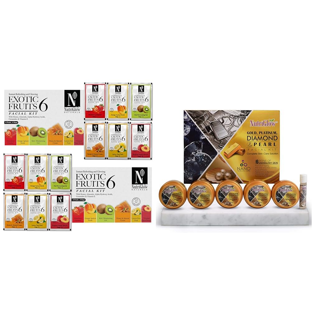 NutriGlow Natural's Exotic Fruit Facial Kit with Honey Vitamin E for Radiant GlowPack of 2 (60 Gm Each) & Platinum Diamond Gold and Pearl Facial kit 6-Pieces Skin Care Kit For Women 250 gm+10ml
