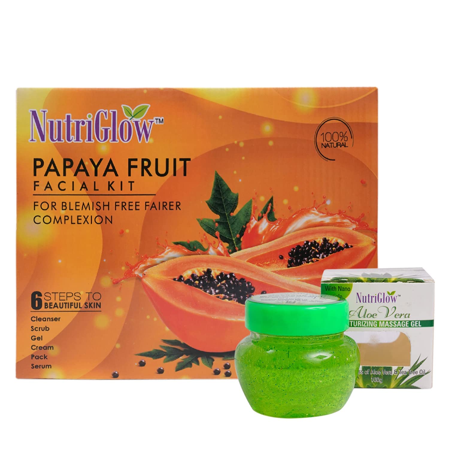 HomeBeautyFace CareFacial KitsNutriGlow Papaya Facial Kit (250gm+10ml) & Aloe Vera Gel (100gm) Blemish Free and Fairer Skin Great for Face Glowing and Radiant Skin Pack of 2