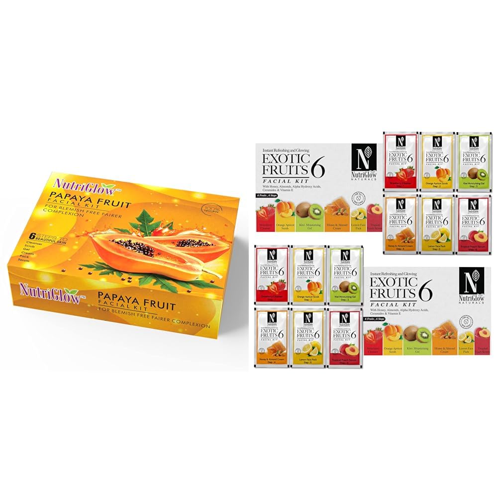 NutriGlow Papaya Fruit Facial Kit for Men Women for Glowing Skin (250 gm + 10 ml) & Natural's Exotic Fruit Facial Kit with Honey Vitamin E for Radiant GlowPack of 2 (60 Gm Each)