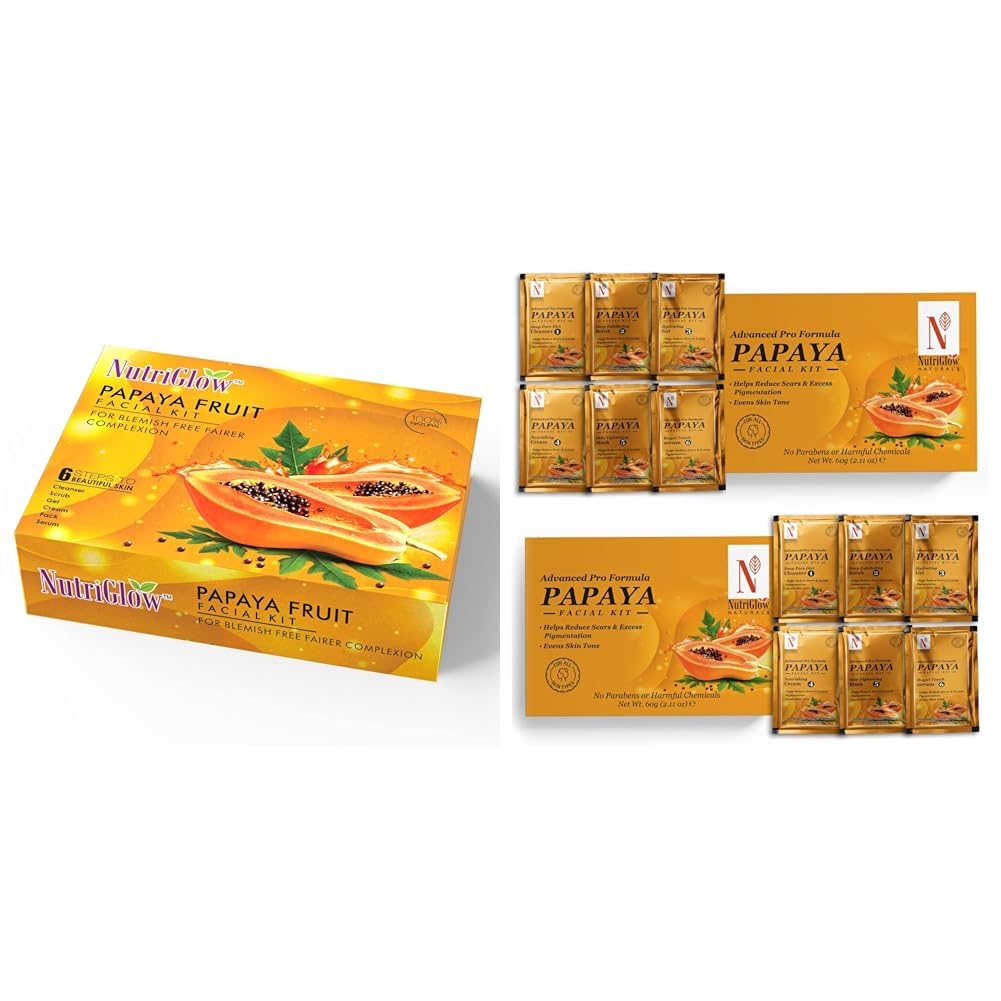 NutriGlow Papaya Fruit Facial Kit for Men Women for Glowing Skin (260 Gram - 10 ml) & NATURAL'S Advanced Pro Formula Papaya Facial Kit For Glowing Skin - 10gmx6 Each Pack of 2