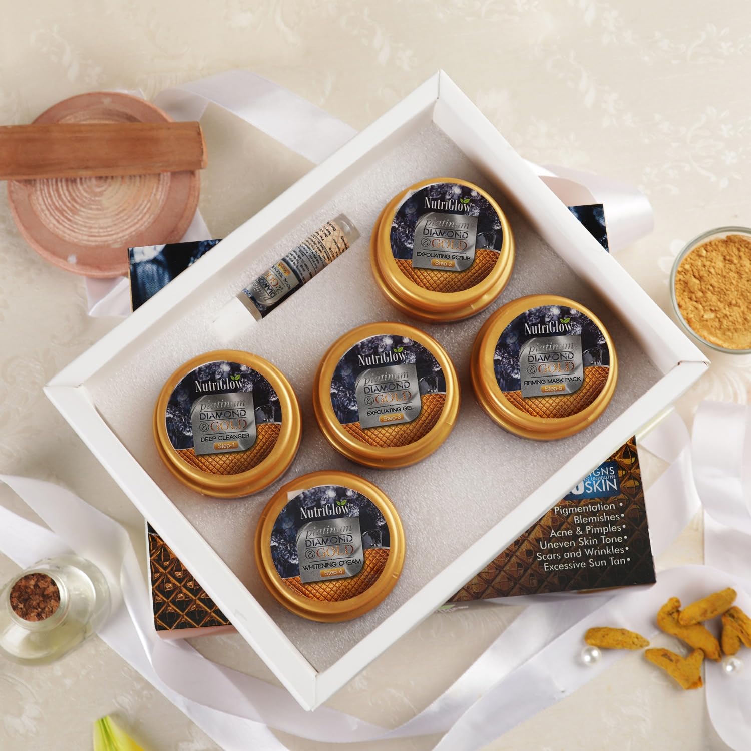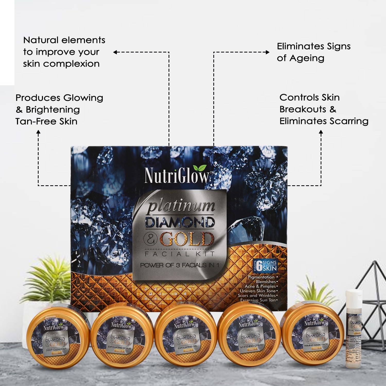 The invigorating energy of diamond and platinum nanoparticles and the healing properties of gold come together in this NutriGlow Platinum Diamond & Gold Facial Kit. Precious metal particles present in these beauty products detoxify the skin paving the way for radiant- and fresh-looking skin. Continuous use of these products leaves your skin nourished with visible changes such as improved complexion less pimples and blemishes reduced wrinkles and lightened skin tone.