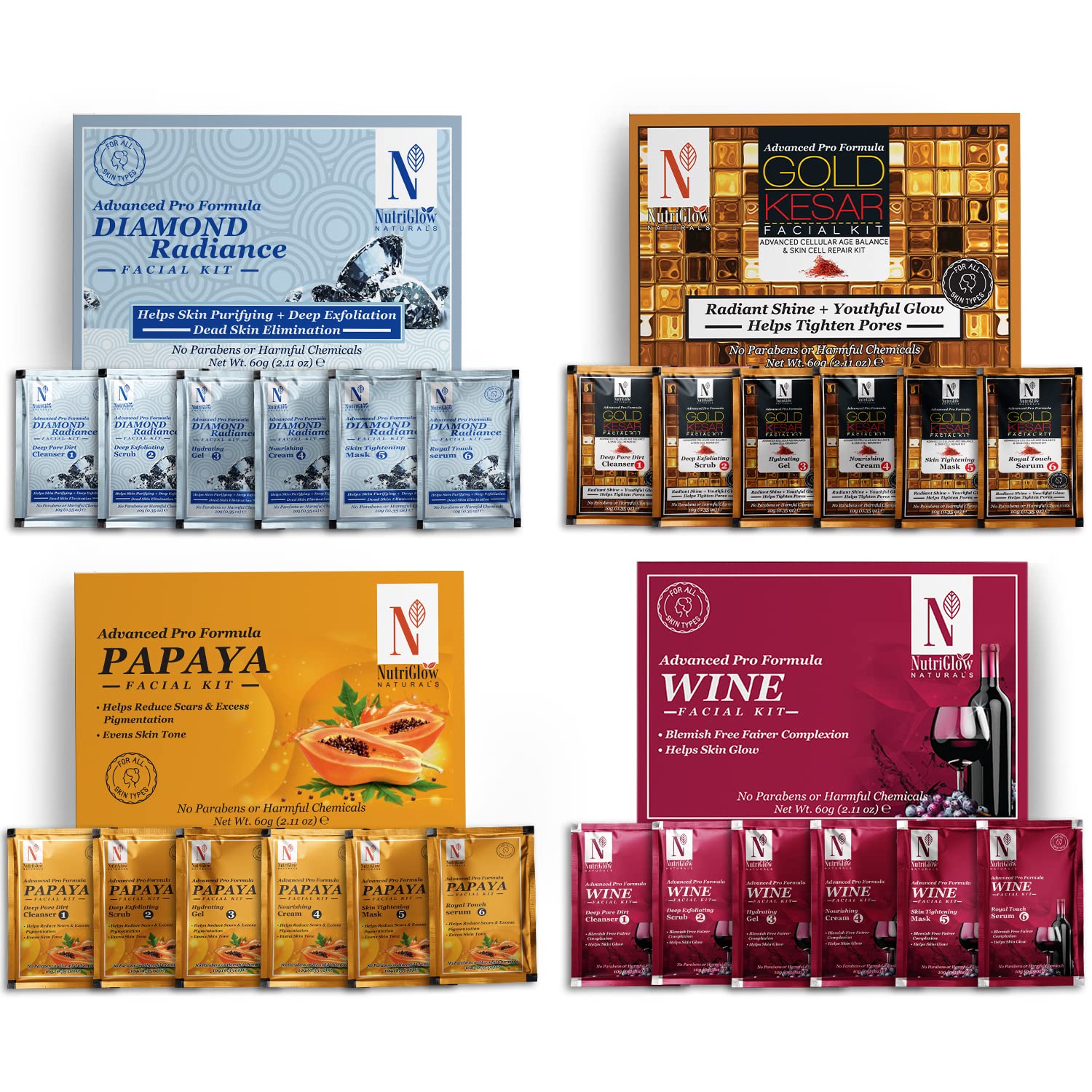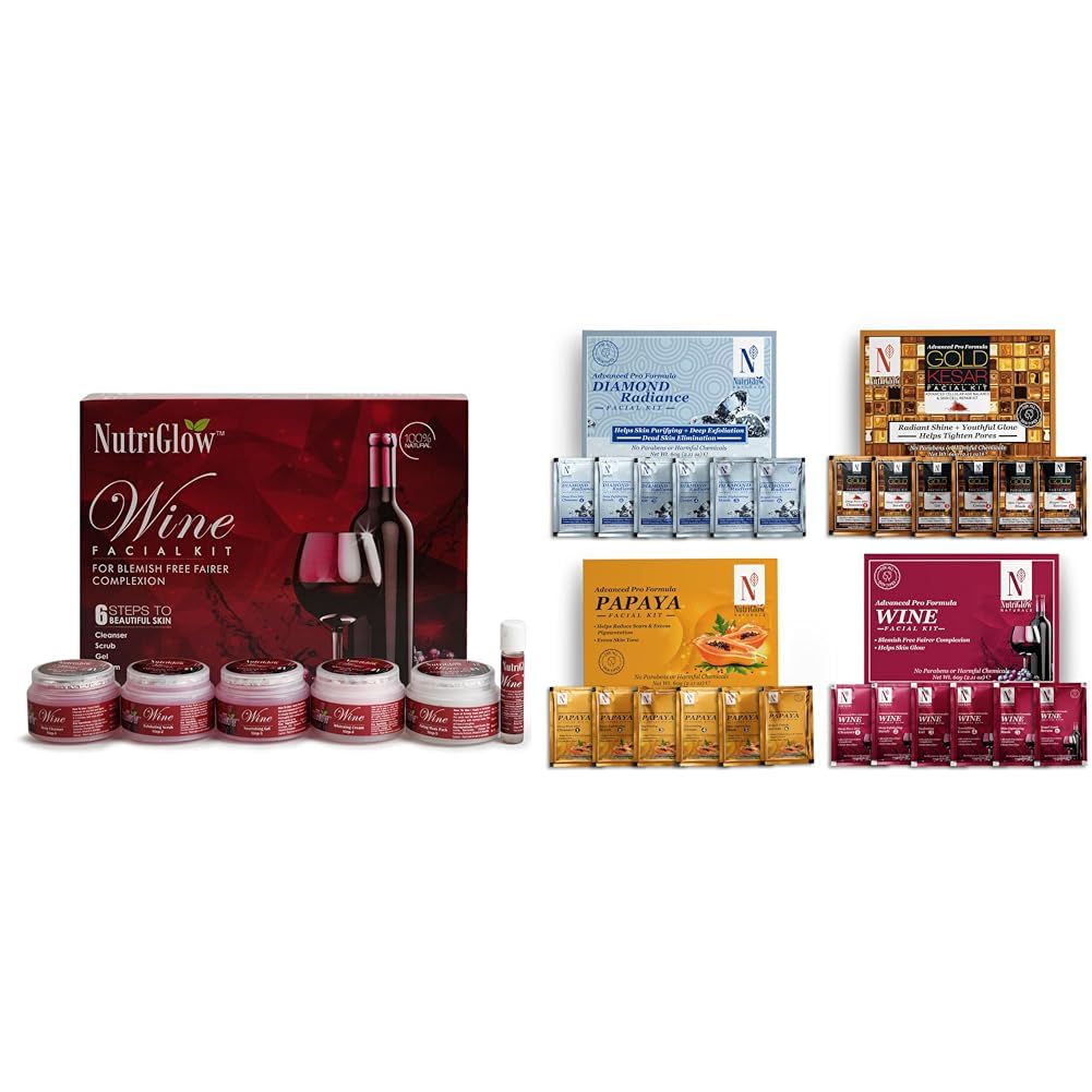 NutriGlow Wine Facial Kit For Radiant Glow All Skin Types- 250g+10mlReverse the signs of aging with the NutriGlow Advanced Red Wine Facial Kit which contains grape extracts the key ingredient of red wine. Red wine is also known as the Red Elixir of Youth. The cooling blend is made from Red Grape seeds revered since antiquity for its calming and hydrating benefits which works to remove impurities and clarify the complexion for healthier-looking skin. Regular use after cleansing imparts a healthy-looking glow. Instant Visible Skin Fairness on chair results. Inhibits Excessive Melanin production. Reverse the sing of ageing Detoxifies skin Speeds up renewal of cells Protects from wrinklesNutriGlow NATURAL'S Advanced Pro Formula Cleanup Kit All Type of Skin Solution for men & women 60 gm (Pack of 4)Elevate your skincare routine with our Combo of 4 Facial Kits curated to deliver professional-quality results in the comfort of your home. Experience the luxury of Diamond Radiance the indulgence of Wine the revitalization of Papaya and the luxury of Gold Kesar all in one comprehensive set. Each kit is meticulously crafted with premium ingredients to address various skin concerns from dullness to dryness ensuring a radiant complexion after each use. Pamper yourself with spa-like treatments without the hassle of salon appointments. Whether you want to hydrate or rejuvenate our facial kits offer versatile solutions for all skin types. Treat yourself or surprise a loved one with this convenient and economical pack designed to elevate your skincare regimen to new heights of indulgence.