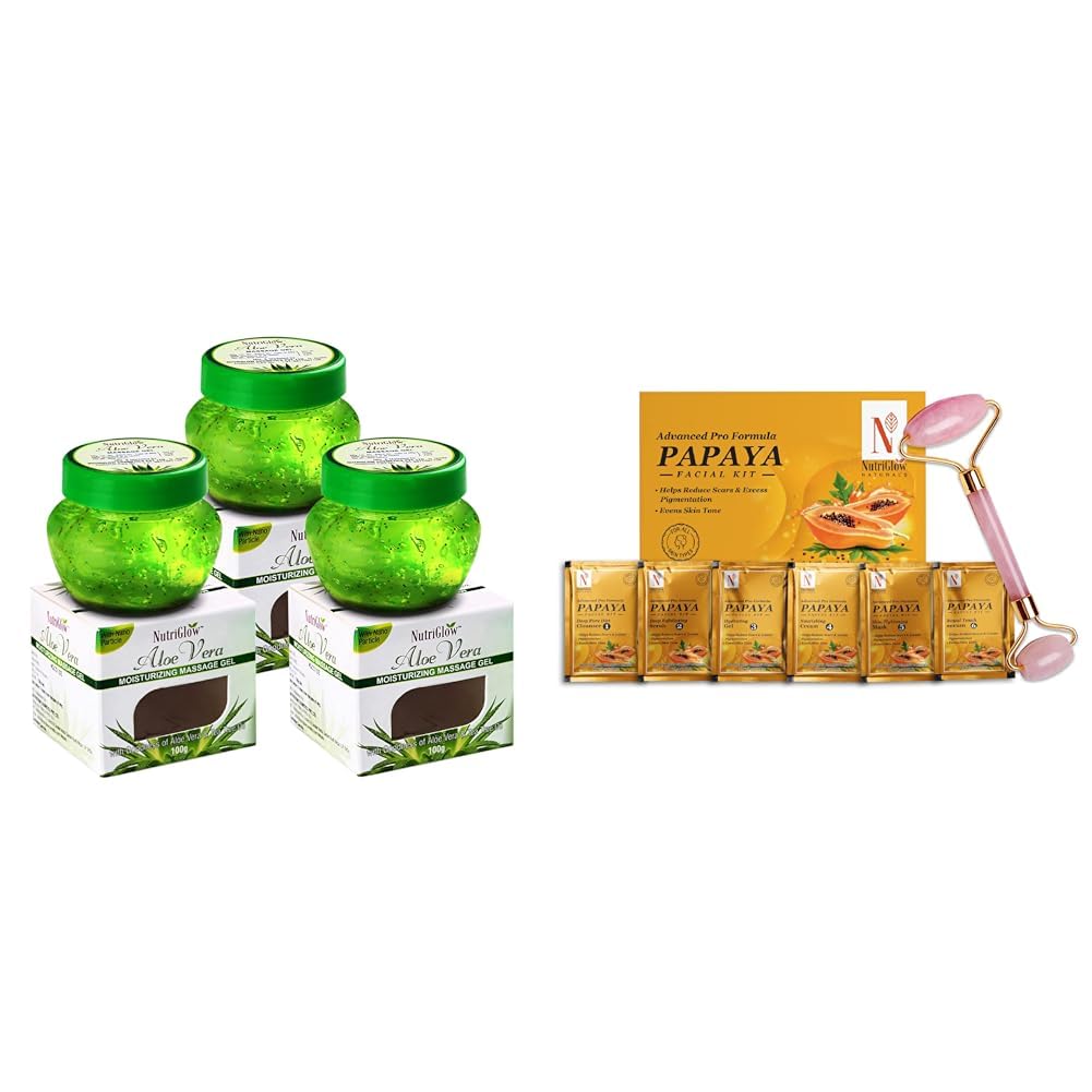 HomeBeautyFace CareFacial KitsNutriGlowAloe Vera Gel Great For Face Hair 100gm Each Pack of 3NATURAL'S Papaya Facial Kit For Blemish Free and Fairer Skin 60gm With Jade Roller