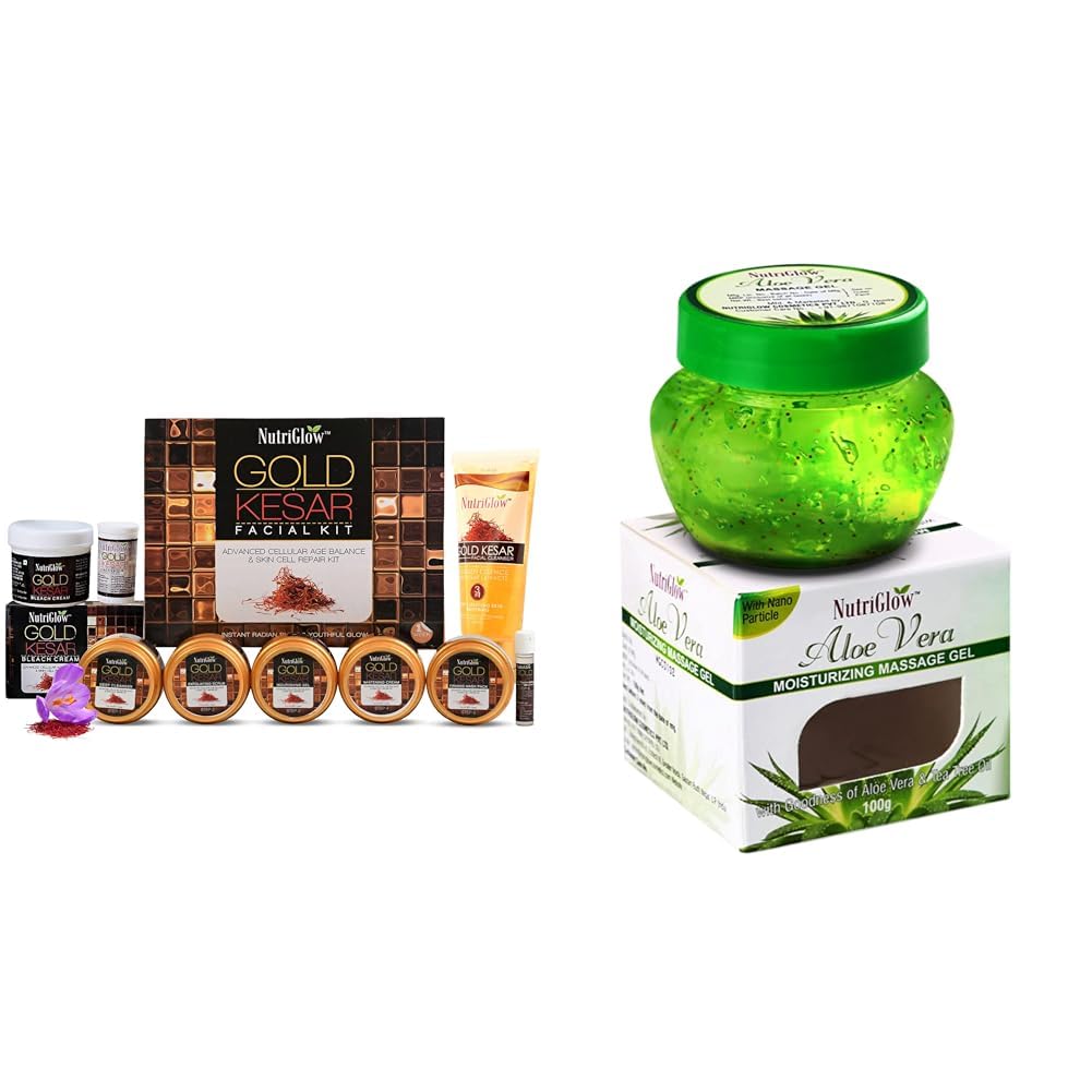 HomeBeautyFace CareFacial KitsNutriGlowGold Kesar Facial Kit (250gm + 10ml) with Bleach Cream (43gm) & Face Wash (65ml)Aloe Vera Gel Great for Face Hair 100gm