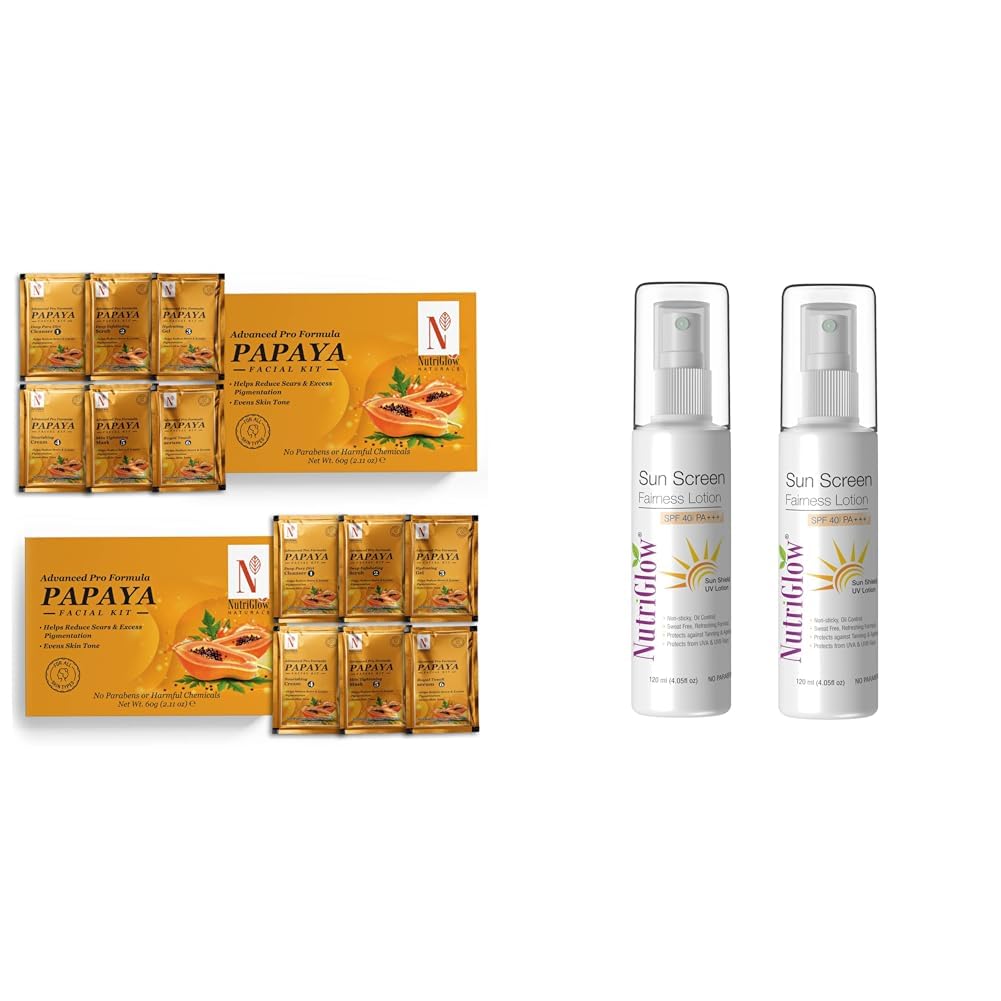 NutriGlowNATURAL'S Advanced Pro Formula Papaya Facial Kit For Glowing Skin - 10gmx6 EachSunscreen Lotion SPF 40 & PA+++ 120ml (Pack of 2)