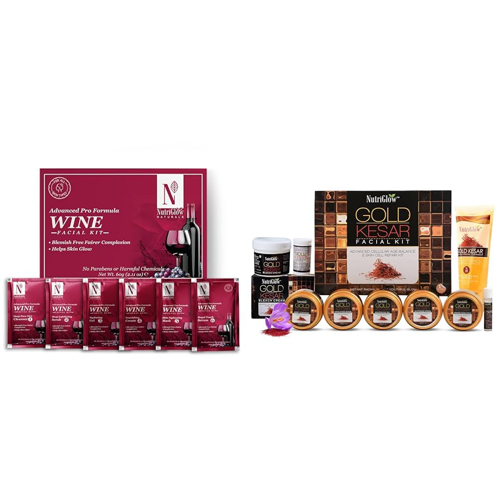NutriGlowNATURAL'S Advanced Pro Formula Wine Facial Cleanup Kit 60 GMGold Kesar Facial Kit (250gm + 10ml) with Bleach Cream (43gm) & Face Wash (65ml) All Skin Types (Pack Of 3)