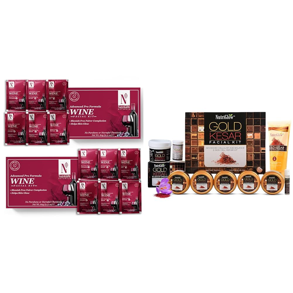 NutriGlowNATURAL'S Advanced Pro Formula Wine Facial Cleanup Kit With Goodness Of Red Grape Extracts 60 gm ( Pack of 2 )Gold Kesar Facial Kit (250gm + 10ml) with Bleach Cream (43gm) & Face Wash (65ml)