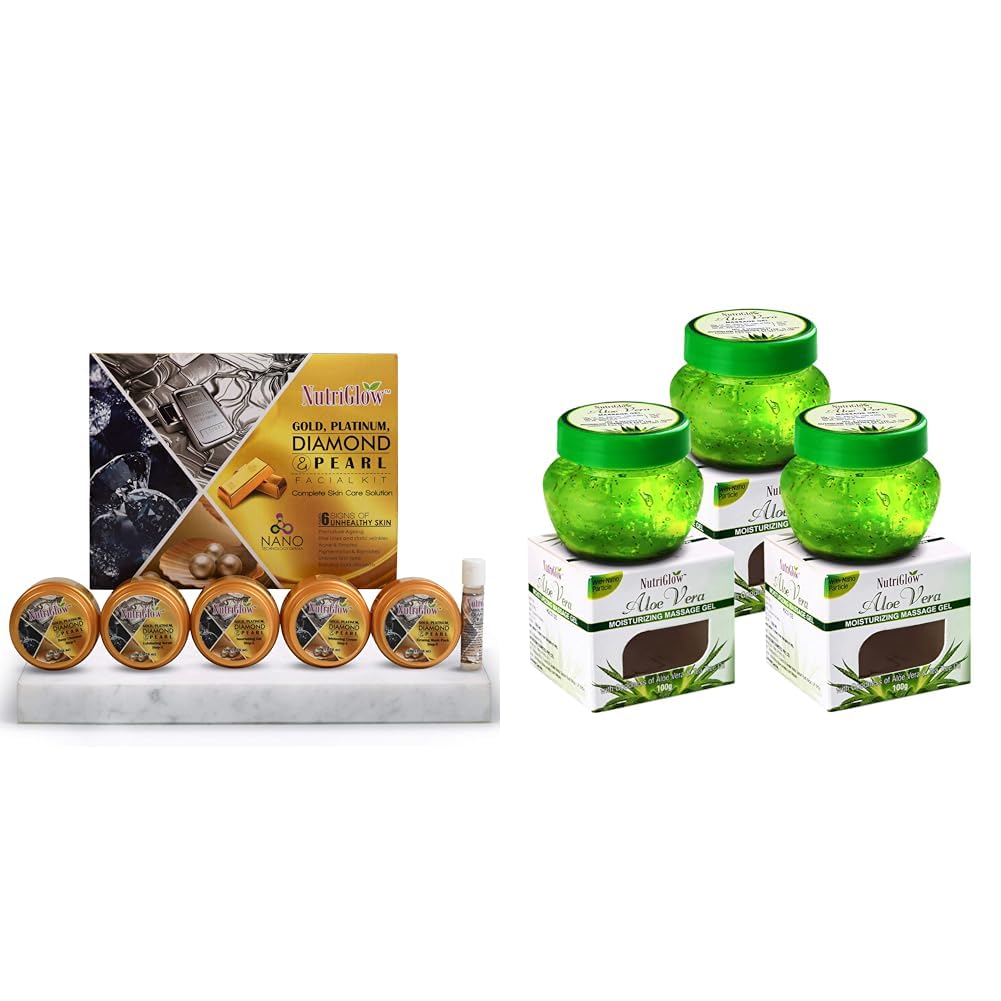 HomeBeautyFace CareFacial KitsNutriGlowPlatinum Diamond Gold and Pearl Facial kit 6-Pieces Skin Care Kit Aloe Vera Gel Great For Face Hair 100gm Each Pack of 3